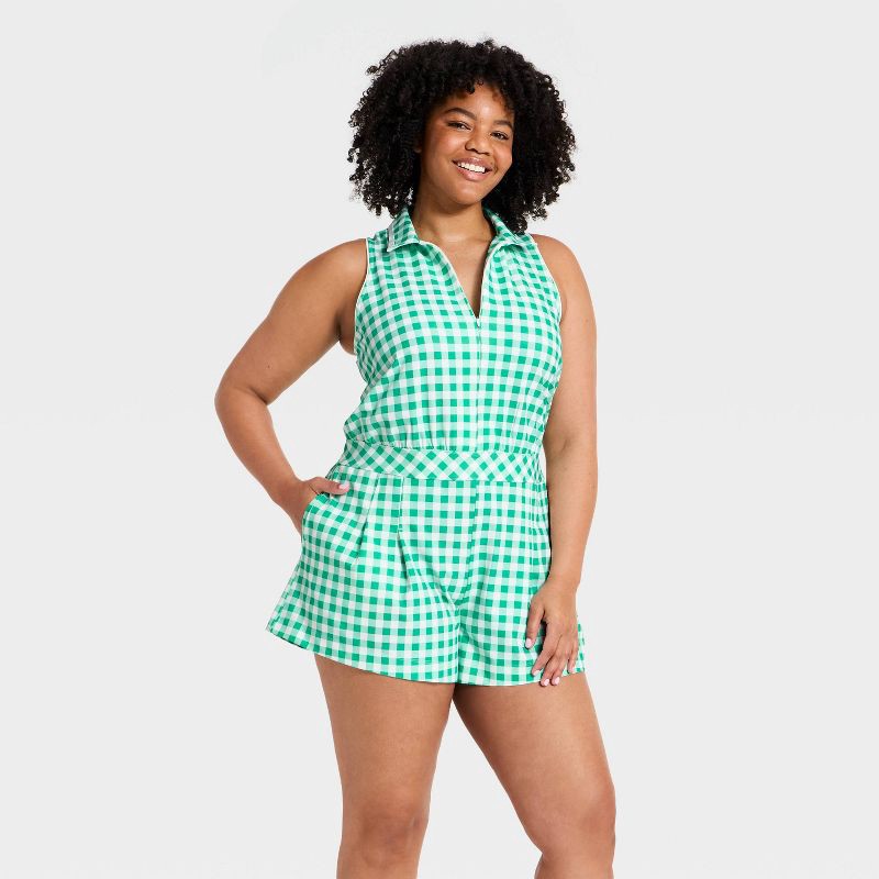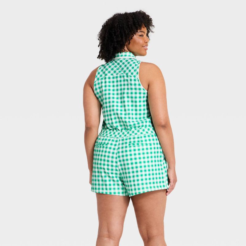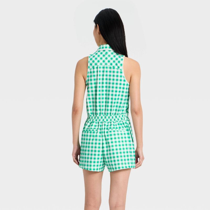 Women's Sleeveless Knit Pleated Romper - All In Motion™ Forest Green Gingham M