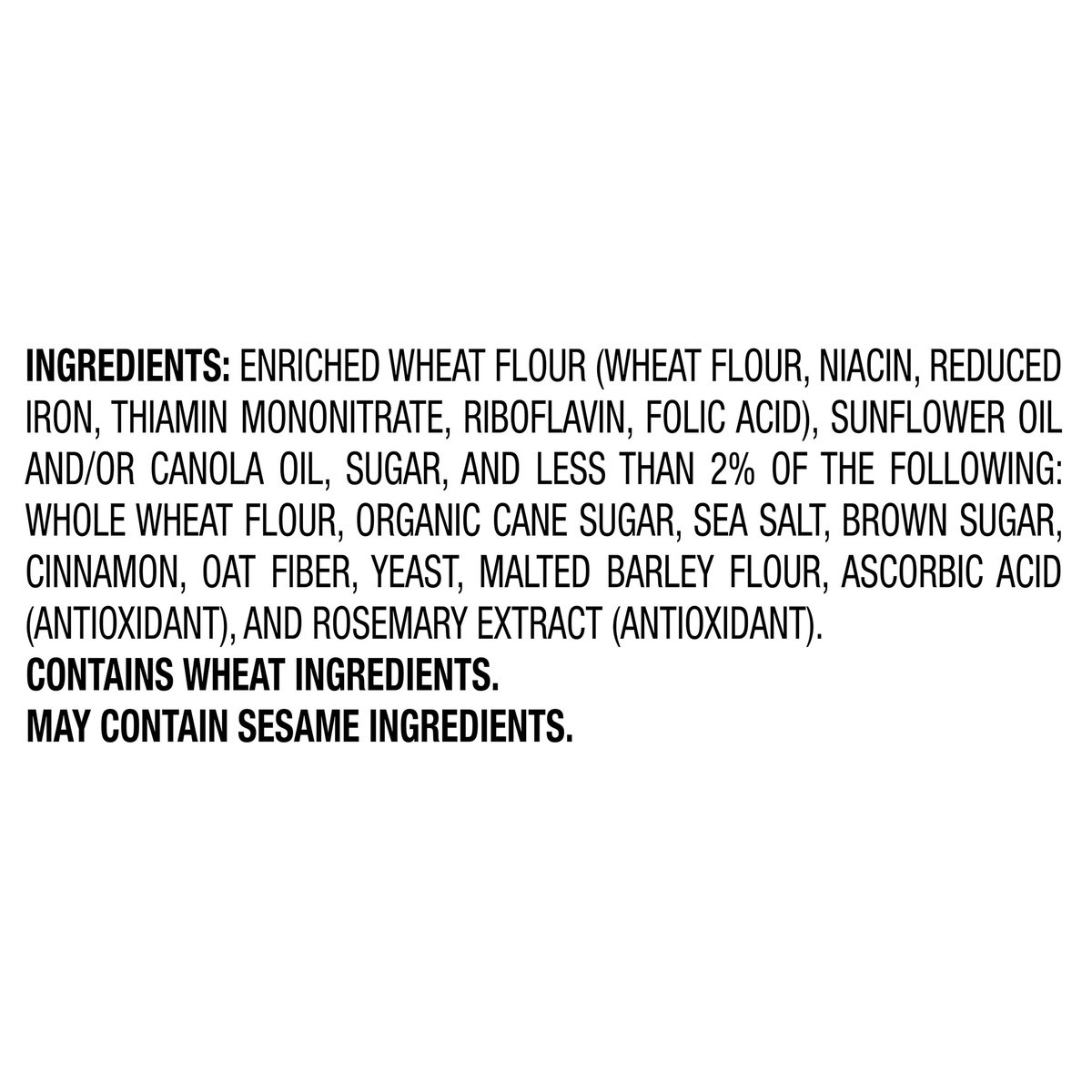 Enriched Wheat Flour (Wheat Flour, Niacin, Reduced Iron, Thiamin Mononitrate, Riboflavin, Folic Acid), Sunflower Oil and/or Canola Oil, Sugar, and Less than 2% of the Following: Whole Wheat Flour, Org…