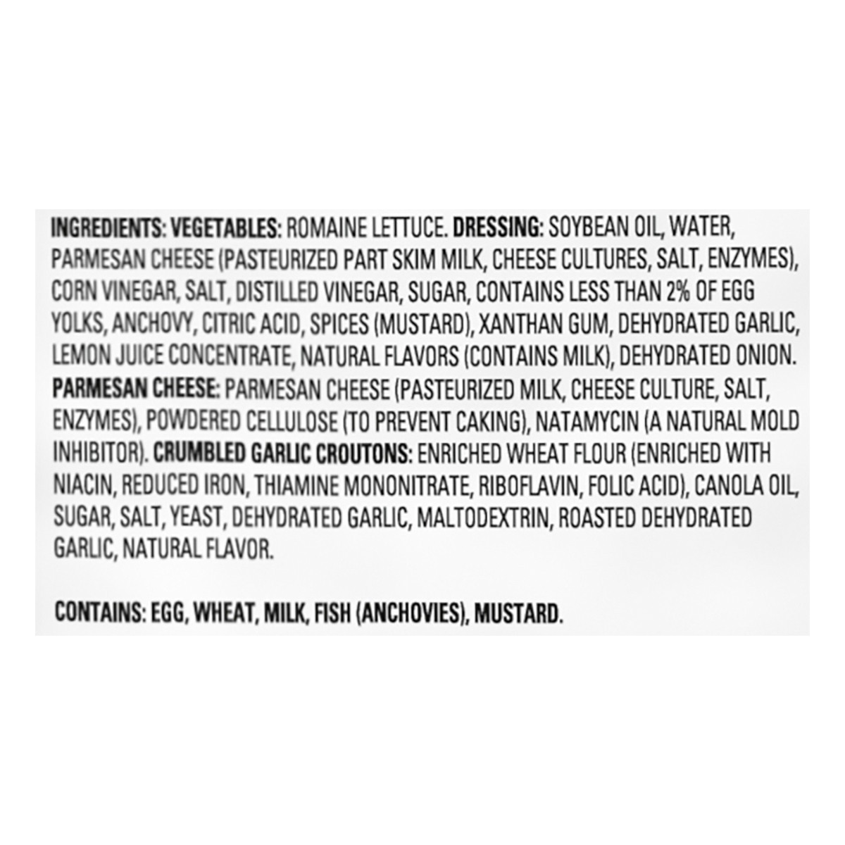 Vegetables: Romaine Lettuce. Dressing: Soybean Oil, Water, Parmesan Cheese (Pasteurized Part Skim Milk, Cheese Cultures, Salt, Enzymes), Corn Vinegar, Salt, Distilled Vinegar, Sugar, Contains Less tha…