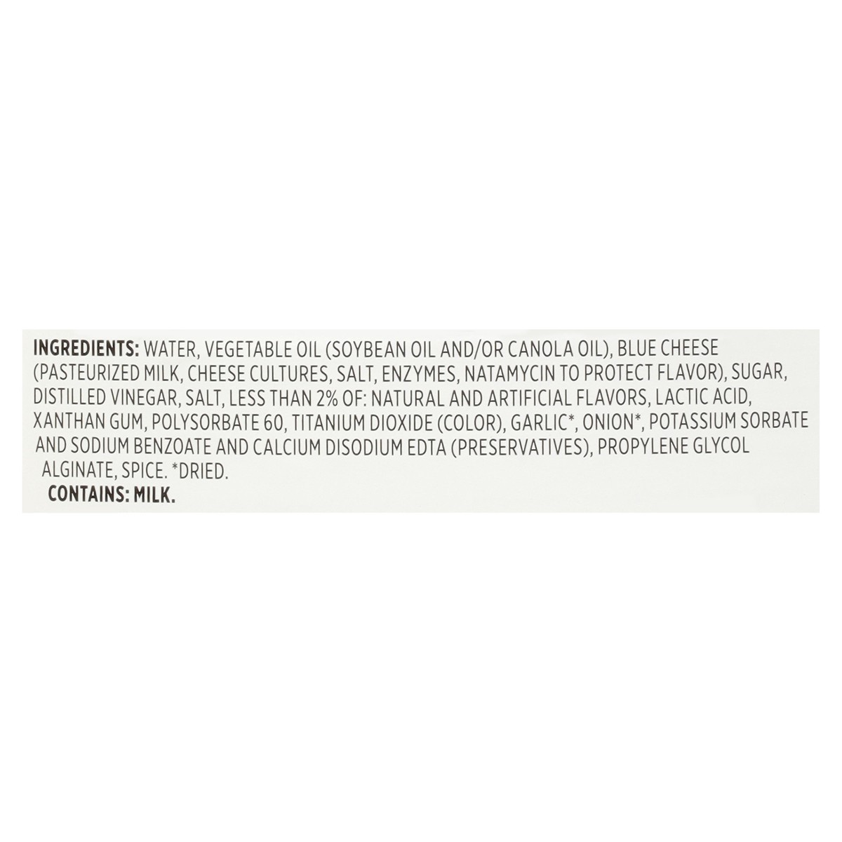 Water, Vegetable Oil (Soybean Oil and/or Canola Oil), Blue Cheese (Pasteurized Milk, Cheese Cultures, Salt, Enzymes, Natamycin to Protect Flavor), Sugar, Distilled Vinegar, Salt, Less than 2% of: Natu…