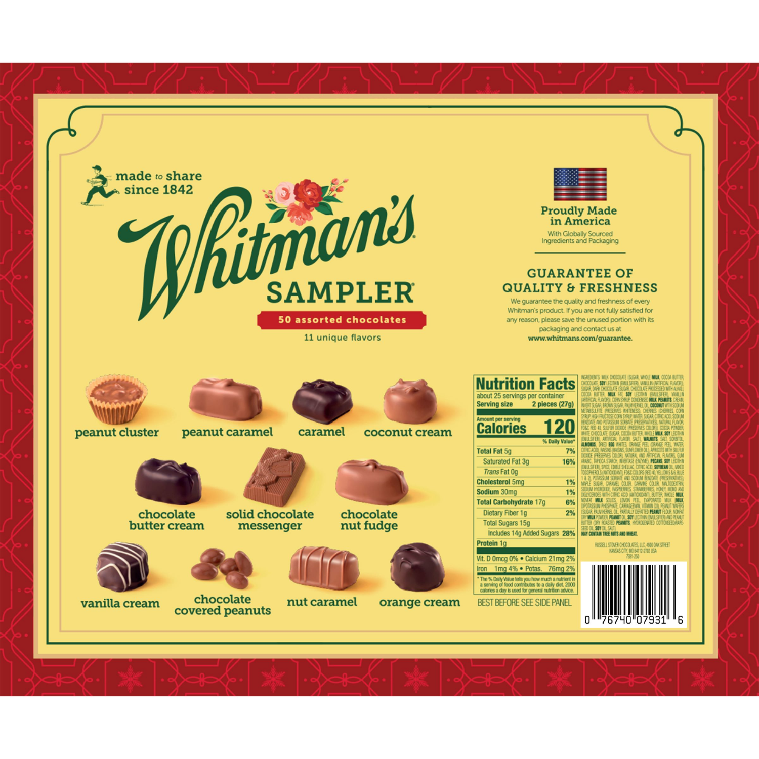 It's no surprise that our Whitman's sampler is america's favorite box of chocolates. Delicious candies from cashew clusters to cherry cordials and maple fudge that fill the distinctive yellow box. A s…