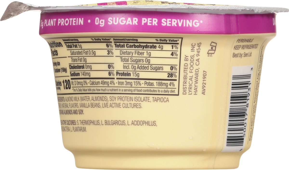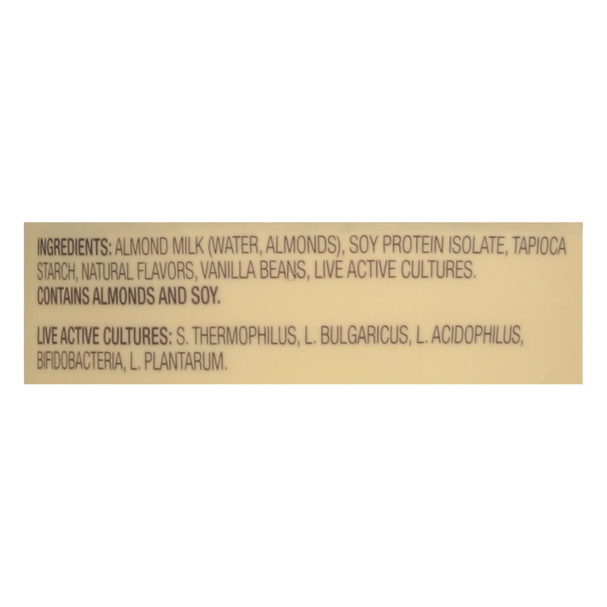 Almond Milk (Water, Almonds), Soy Protein Isolate, Tapioca Starch, Natural Flavors, Vanilla Beans, Live Active Cultures, Live Active Cultures: S. Thermophilus, L. Bulgaricus, L. Acidophilus, Bfidobact…
