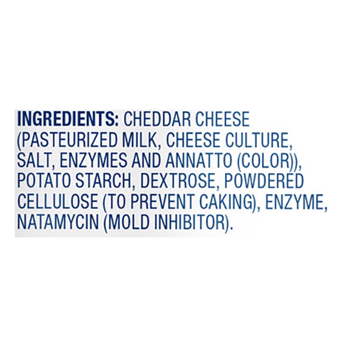 Cheddar Cheese (Pasteurized Milk, Cheese Culture, Salt, Enzymes and Annatto [Color]), Potato Starch, Dextrose, Powdered Cellulose (to Prevent Caking), Enzyme, Natamycin (Mold Inhibitor).