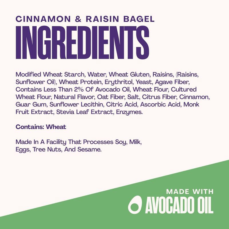 MODIFIED WHEAT STARCH, WATER, WHEAT GLUTEN, RAISINS, (RAISINS, SUNFLOWER OIL), WHEAT PROTEIN, ERYTHRITOL, YEAST, AGAVE FIBER, CONTAINS LESS THAN 2% OF AVOCADO OIL, WHEAT FLOUR, CULTURED WHEAT FLOUR, N…