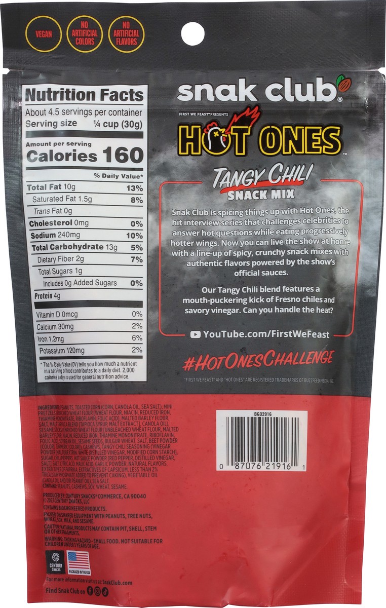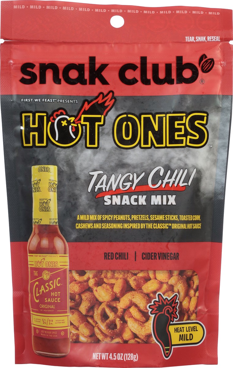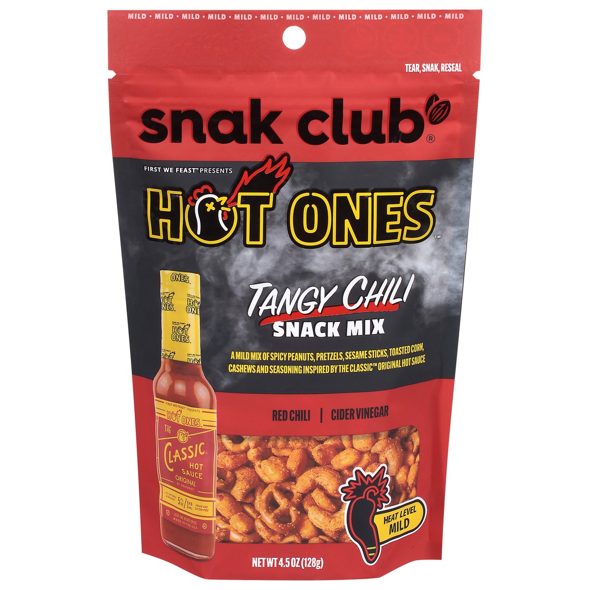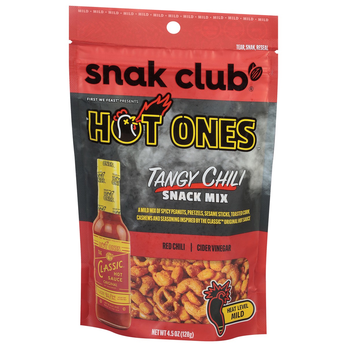 Snack Mix flavored with Hot Ones The Classic Hot Sauce. Contains Spicy Peanuts, Pretzels, Sesame Sticks, Toasted Corn, and Cashews. Mild Heat.