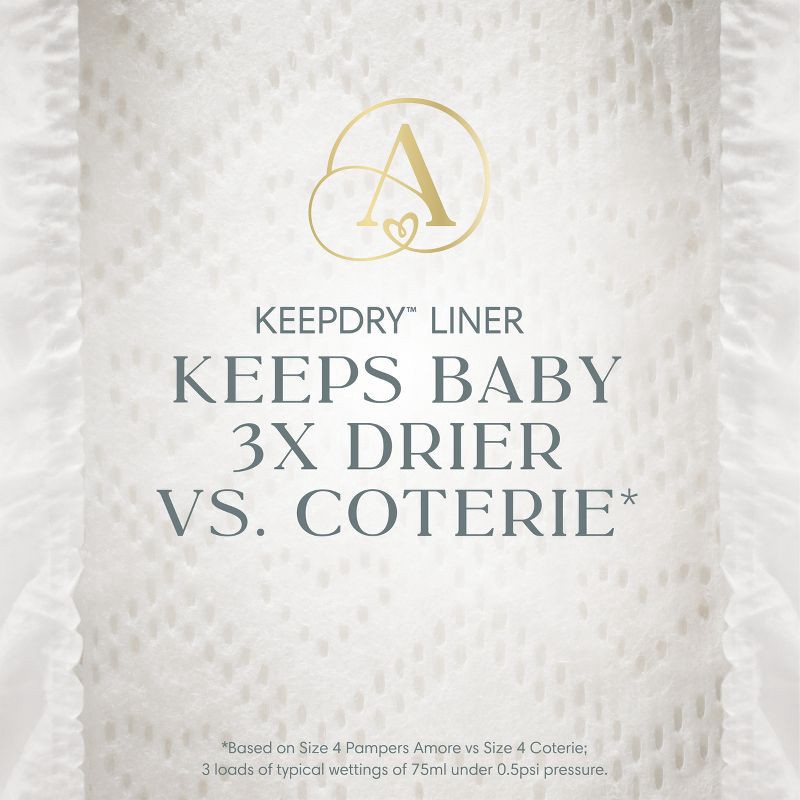 - KeepDry liner for unbeatable dryness* and comfort (*Based on size 4 Pampers Amore. 3 typical wettings of 75ml under 0.5psi pressure. Among day-and-night taped diapers)
