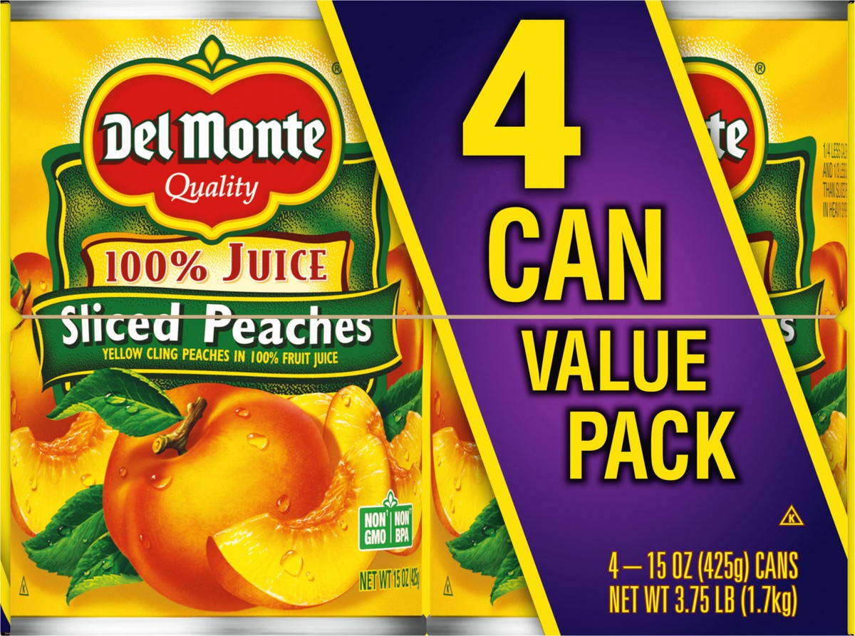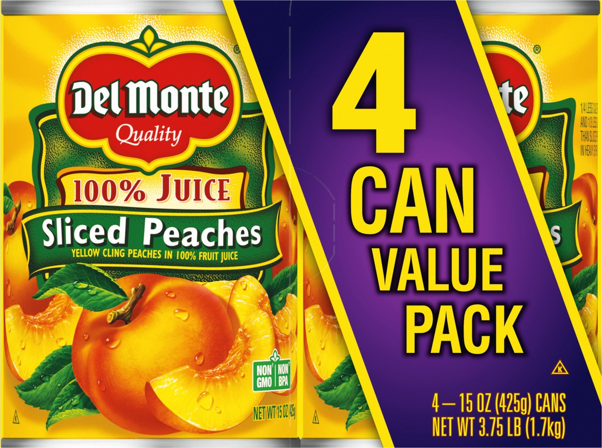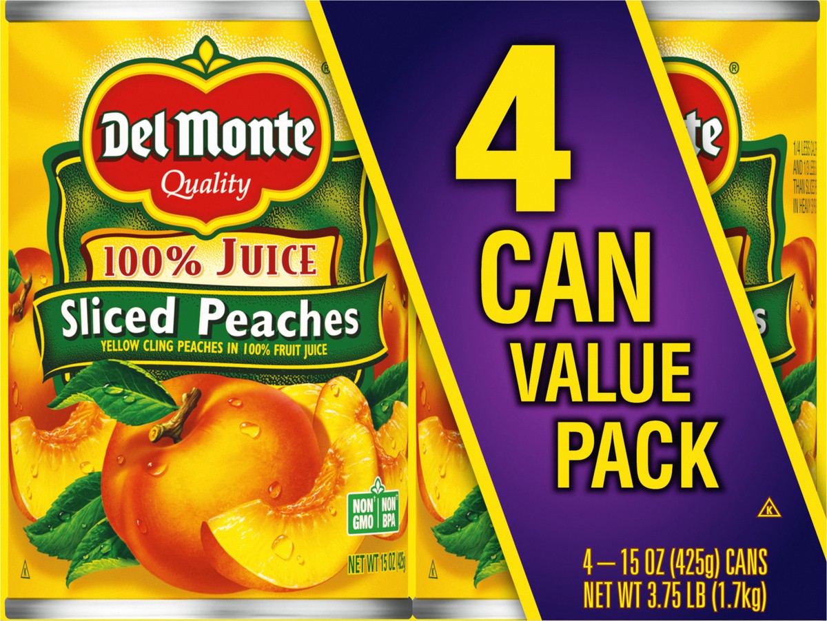 DEL MONTE Yellow Cling Sliced Peaches in 100% Juice, Canned Fruit, 4 Pack, 15 oz Cans