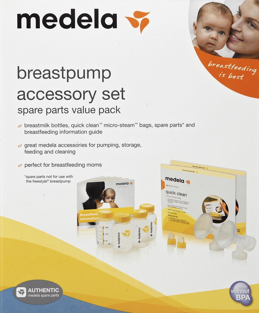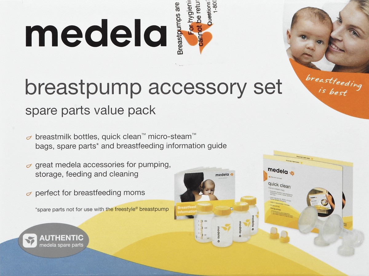 Spare parts value pack. Breastmilk bottles, Quick Clean micro-steam bags, spare parts (Spare parts not for use with the Freestyle breastpump) and breastfeeding information guide. Great Medela accessor…