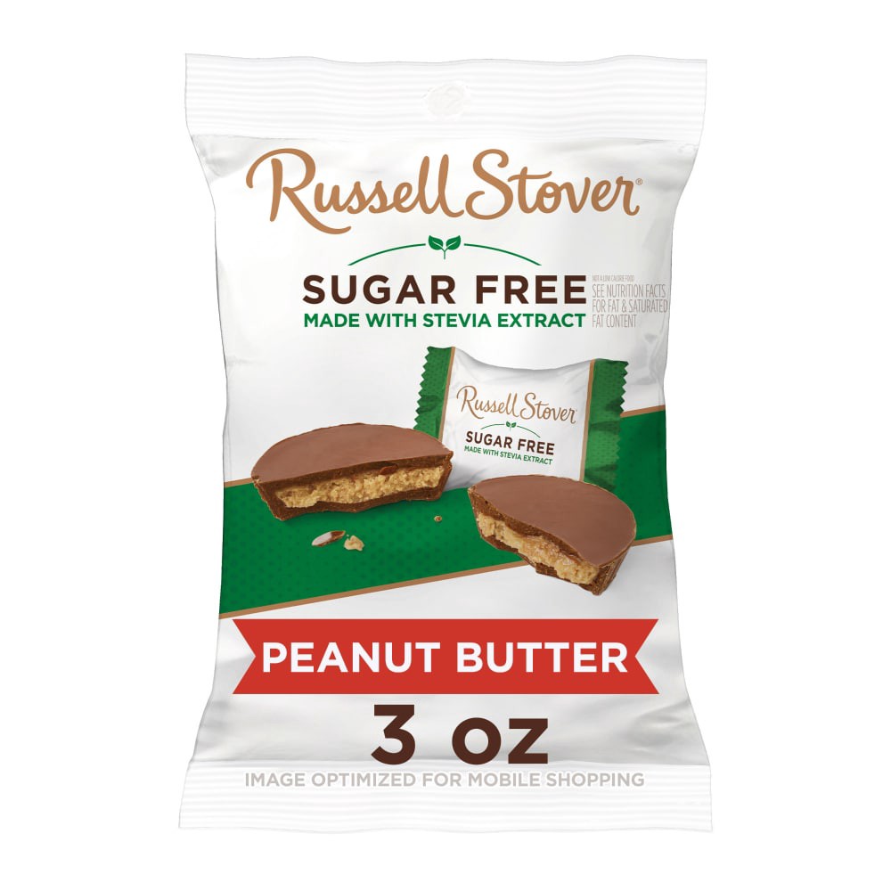 Russell Stover Sugar Free Peanut Butter Cup Chocolate Candy, 3 oz., contains individually wrapped pieces of chocolate candy cups filled with smooth, creamy peanut butter and made with Stevia extract, …