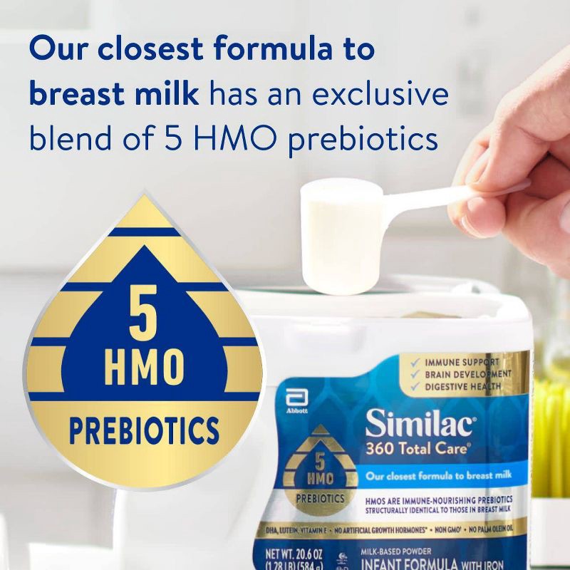 - HAS OUR CLOSEST PREBIOTIC BLEND TO THAT IN BREAST MILK: Similac 360 Total Care, our biggest formula breakthrough, has an exclusive blend of 5 HMO prebiotics structurally identical to those in breast milk