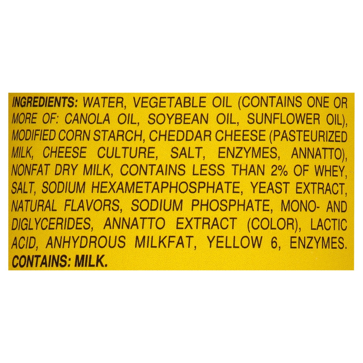 Water, Vegetable Oil (Contains One or More of: Canola Oil, Soybean Oil, Sunflower Oil), Modified Corn Starch, Cheddar Cheese (Pasteurized Milk, Cheese Culture, Salt, Enzymes, Annatto), Nonfat Dry Milk…