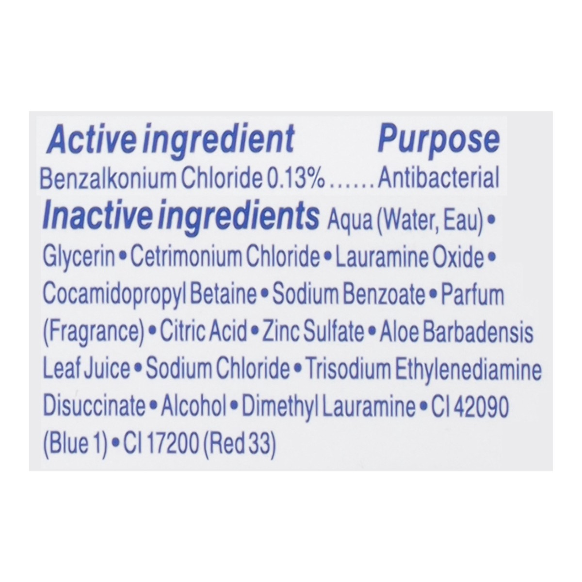 Active Ingredients: Benzalkonium Chloride (0.13 %), Antibacterial. Inactive Ingredients: Aqua (Water, Eau), Glycerin, Cetrimonium Chloride, Lauramine Oxide, Cocamidopropyl Betaine, Sodium Benzoate, Pa…