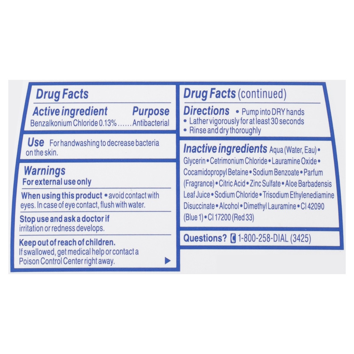 Active ingredient Purpose Benzalkonium Chloride 0.13%. . . . . . . . . . . . . . . . . . Antibacterial Inactive ingredients: Aqua (Water, Eau) · Glycerin · Cetrimonium Chloride · Lauramine Oxide · Coc…