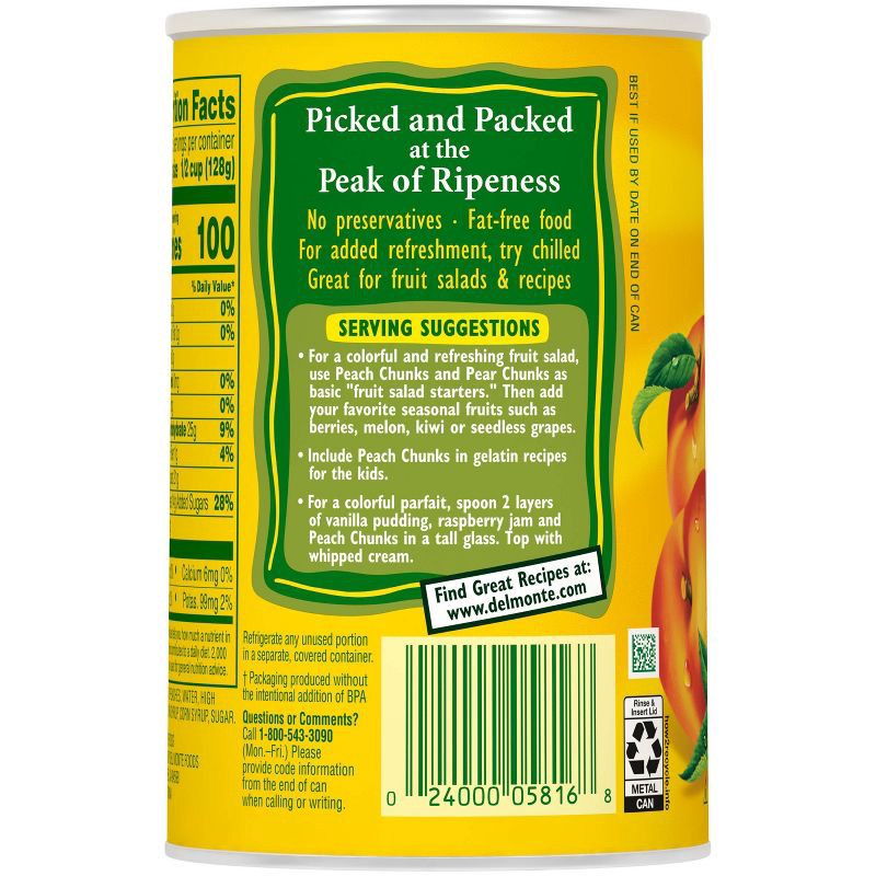 - Canned peach chunks in a Non-BPA* can make a great fruit snack for busy nights