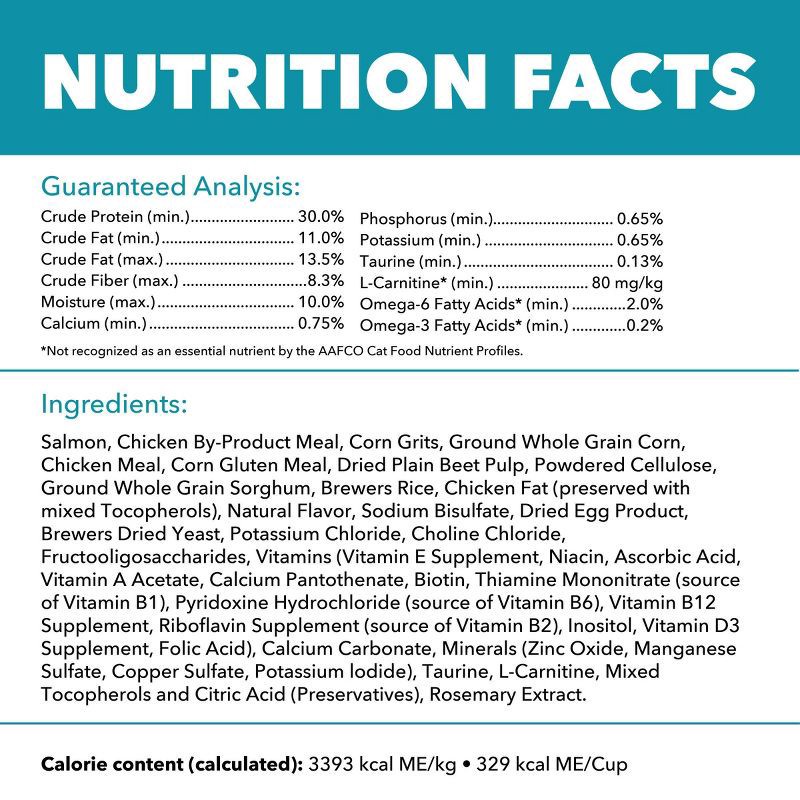 Salmon, Chicken By-Product Meal, Corn Grits, Ground Whole Grain Corn, Chicken, Corn Protein Meal, Dried Plain Beet Pulp, Powdered Cellulose, Ground Whole Grain Sorghum, Brewers Rice, Chicken Fat (pres…