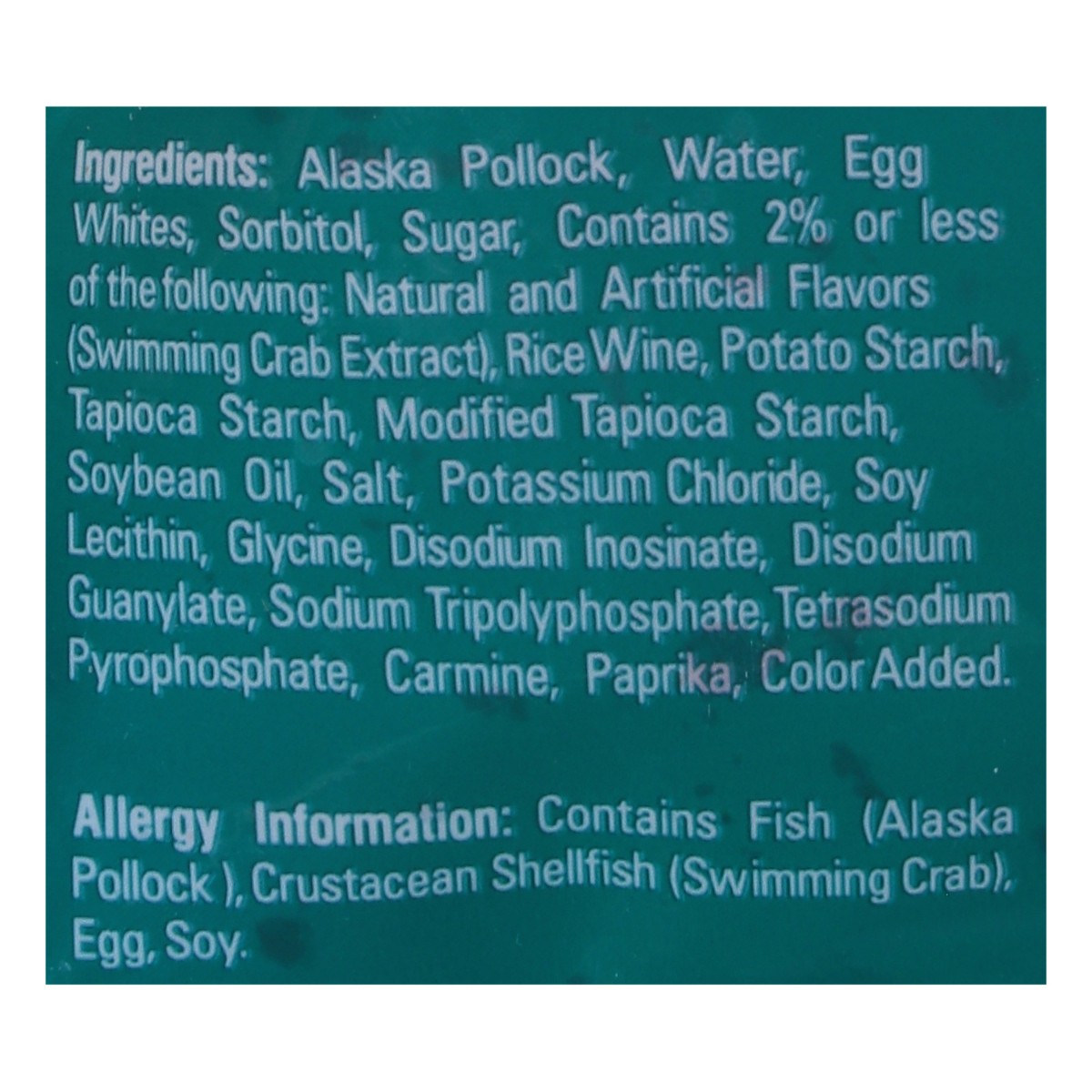 Alaska Pollock, Water, Egg Whites, Sorbitol, Sugar, Contains 2% or Less of the Following: Natural and Artificial Flavors (Swimming Crab Extract), Rice Wine, Potato Starch, Tapioca Starch, Modified Tap…