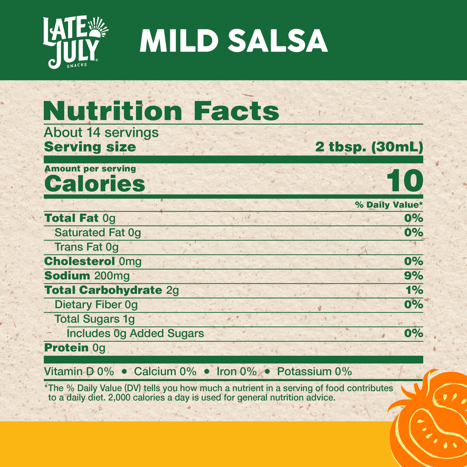 Late July Snacks Mild Salsa has a slight kick with bold flavors. This thick and chunky salsa is crafted with organic diced tomatoes, onions, garlic and jalapenos. The result is a hearty chunky salsa i…