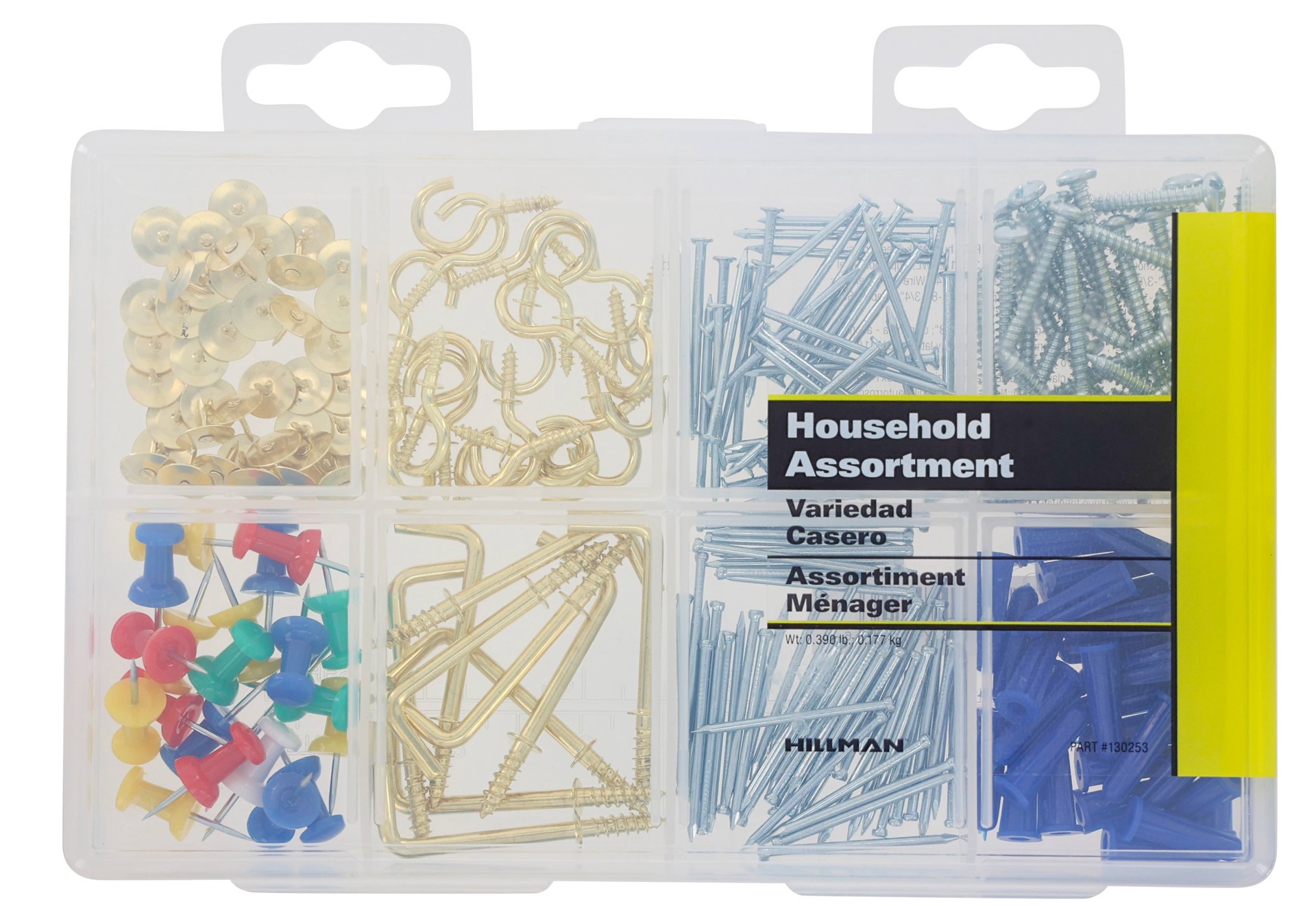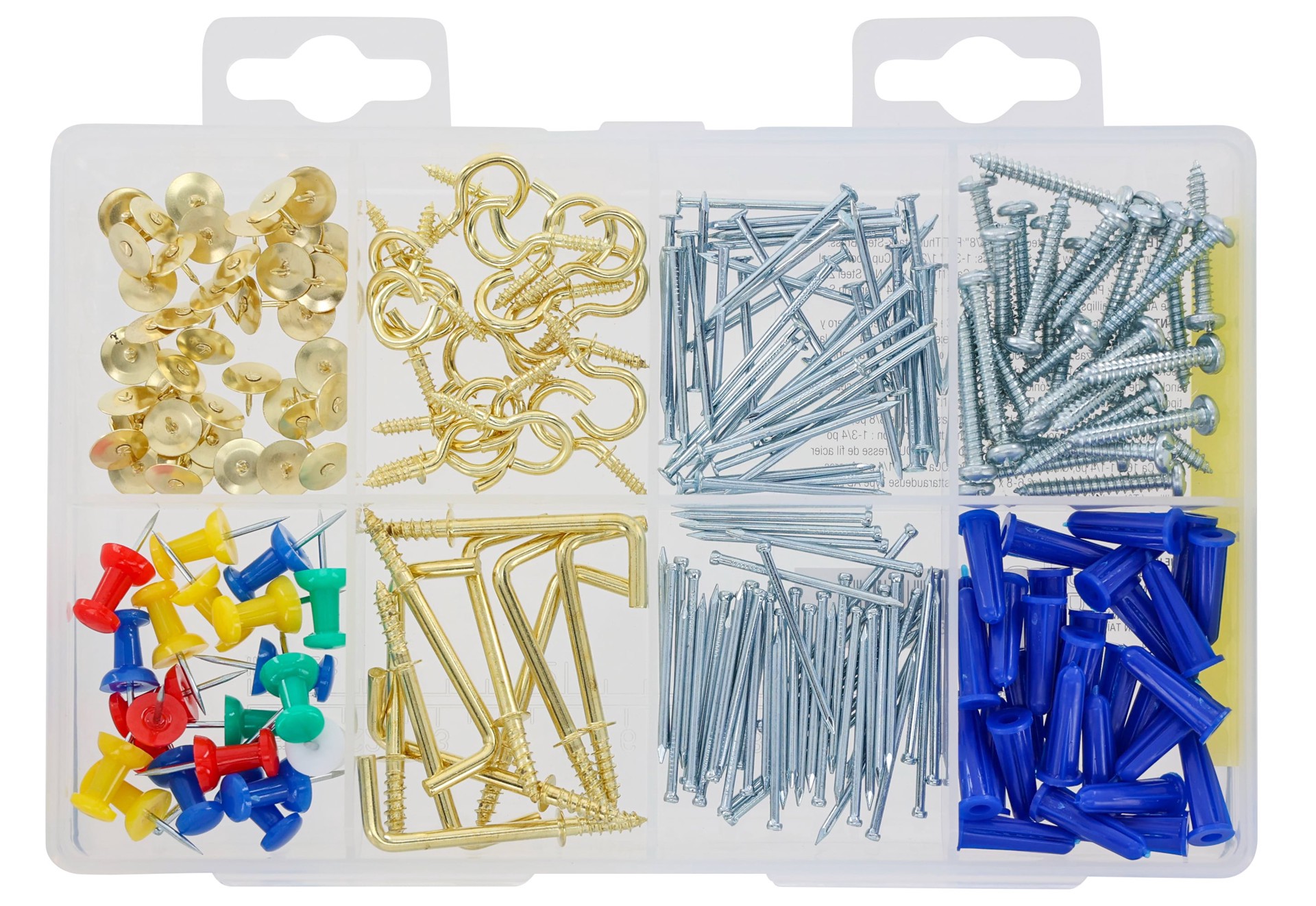 Great for use around the house. Quality Hillman fasteners. Assorted hooks, nails, push pins, screws, thumbtacks and small wall anchors. 240 piece kit.