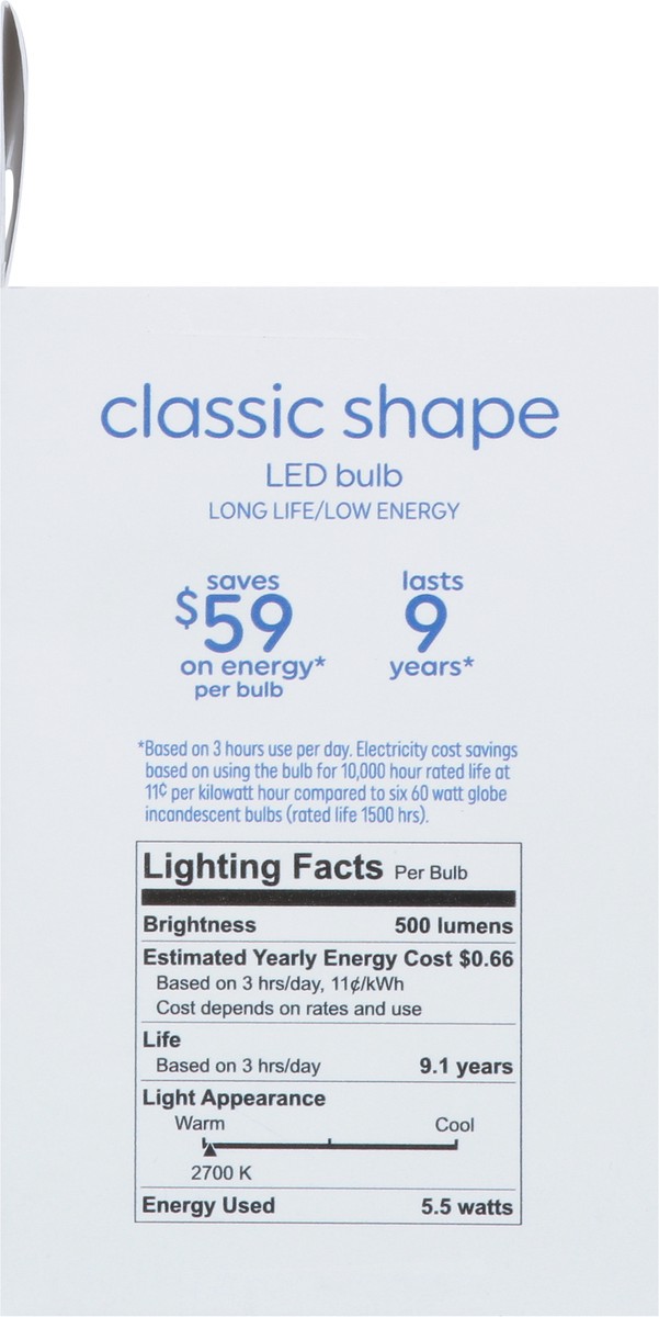 Brightness Quantity: 500 lumens. Energy Info: $0.66 Based on 3 hrs/day, 11 cents/kWh. Cost depends on rates and use. 5.5 watts. Package Info: 2-Pack. 1. Bulb Info: Both. LED. Is Dimmable. Screw. Bulb …