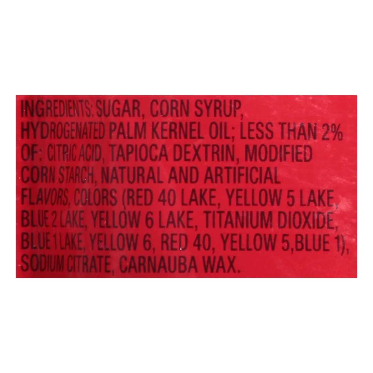Sugar, Corn Syrup Hydrogenated Palm Kernel Oil: Less than 2% of: Citric Acid Tapioca Dextrin, Modified Corn Starch, Natural and Artificial Flavors, Colors (Red 40 Lake, Yellow 5 Lake Blue 2 Lake, Yell…
