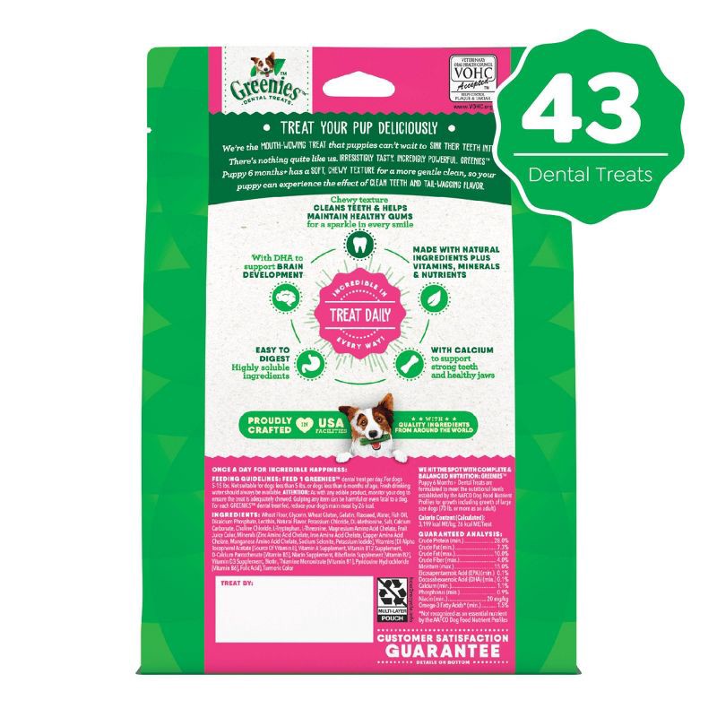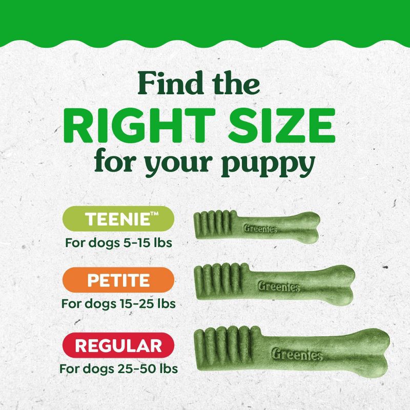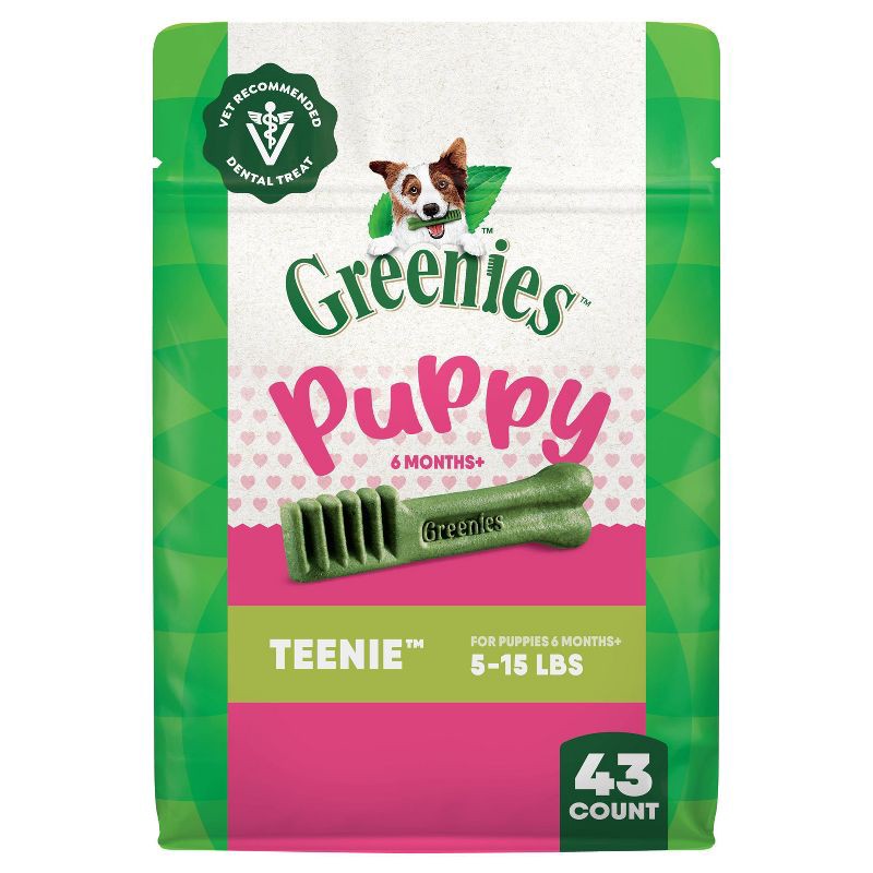 - 12 oz. Pack: Greenies Natural Dental Puppy Treats Teenie Size, Chicken Flavor, 12 oz. Pack, 43 Count.