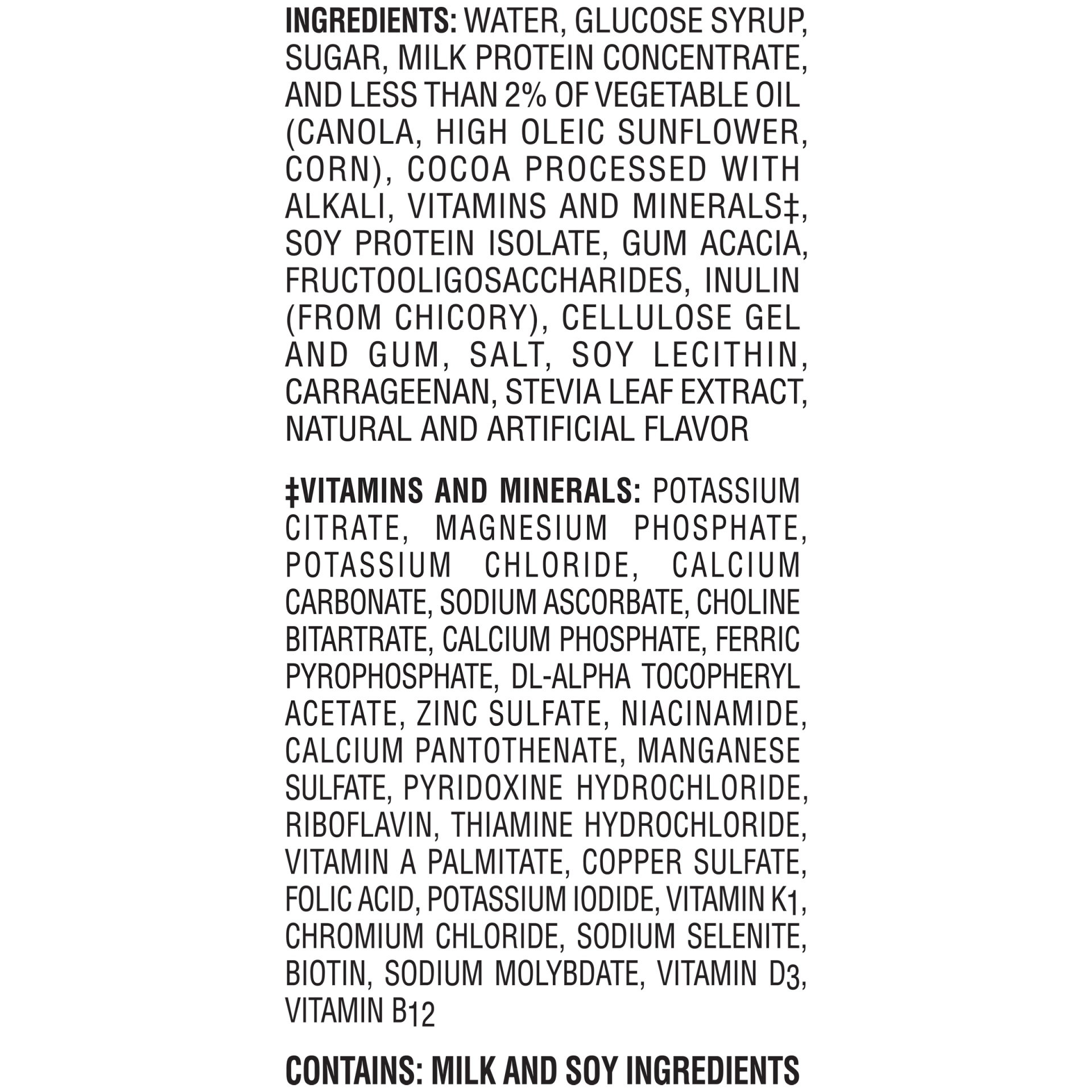 Water, Glucose Syrup, Sugar, Milk Protein Concentrate, and Less than 2% of Vegetable Oil (Canola, High Oleic Sunflower, Corn), Cocoa Processed with Alkali, Vitamins and Minerals‡, Soy Protein Isolate,…