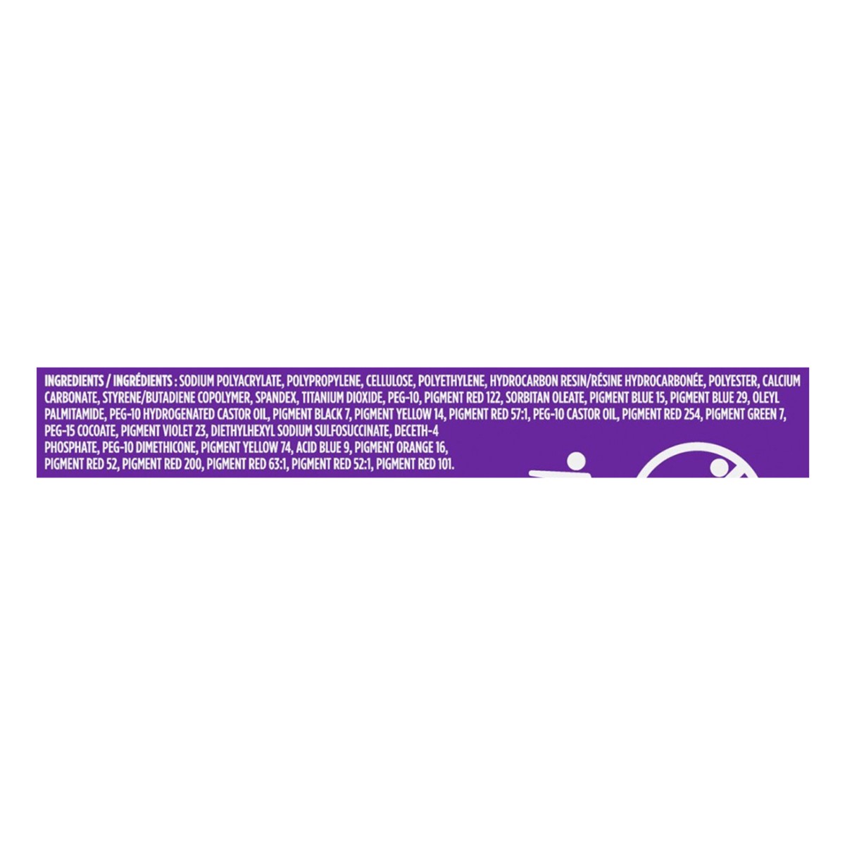 Sodium Polyacrylate, Polypropylene, Cellulose, Polyethylene, Hydrocarbon Resin/Resine Hydrocarbonee, Polyester, Calcium Carbonate, Styrene/Butadiene Copolymer, Spandex, Titanium Dioxide, PEG-10, Pigme…
