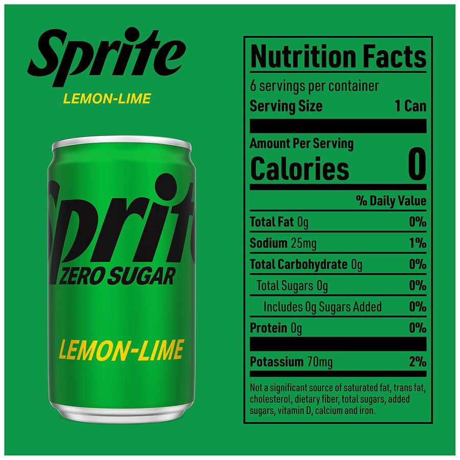 - Quench your thirst with refreshing Sprite Zero Sugar sodaClear, crisp lemon-lime, zero sugar soda will keep you invigorated and inspiredA delicious citrus taste that knows how to keep things coolCaffeine-free, full of 100% natural flavors7.5 fl oz mini can 6 pack to help you cut through the noise