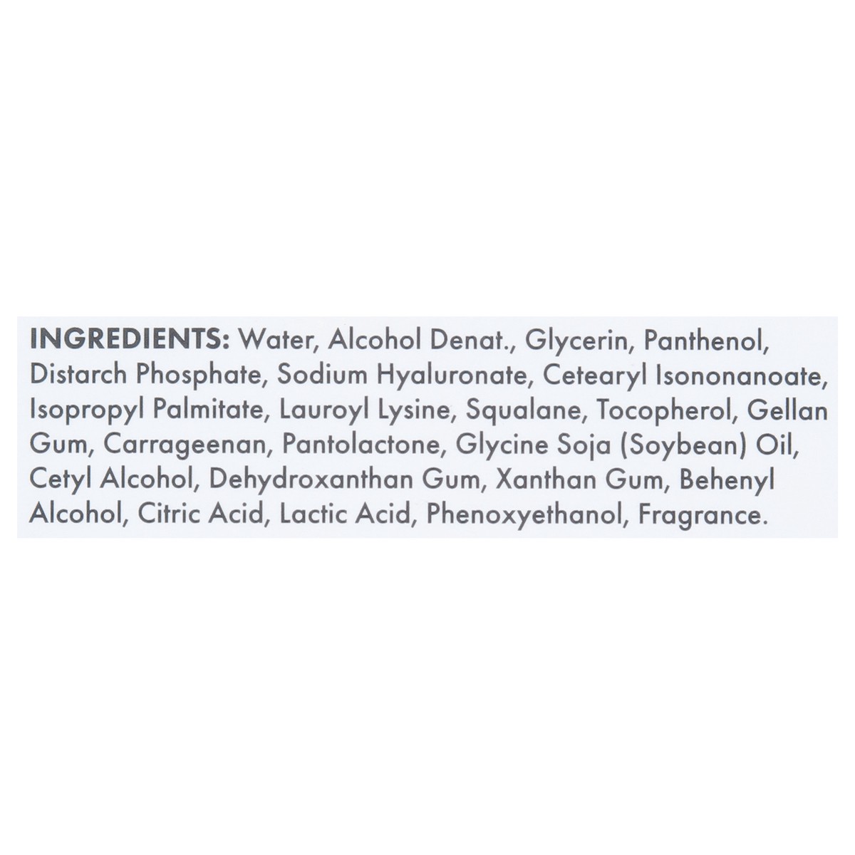 Water, Alcohol Denat., Glycerin, Panthenol, Distarch Phosphate, Sodium Hyaluronate, Cetearyl Isononanoate, Isopropyl Palmitate, Lauroyl Lysine, Squalane, Tocopherol, Gellan Gum, Carrageenan, Pantolact…