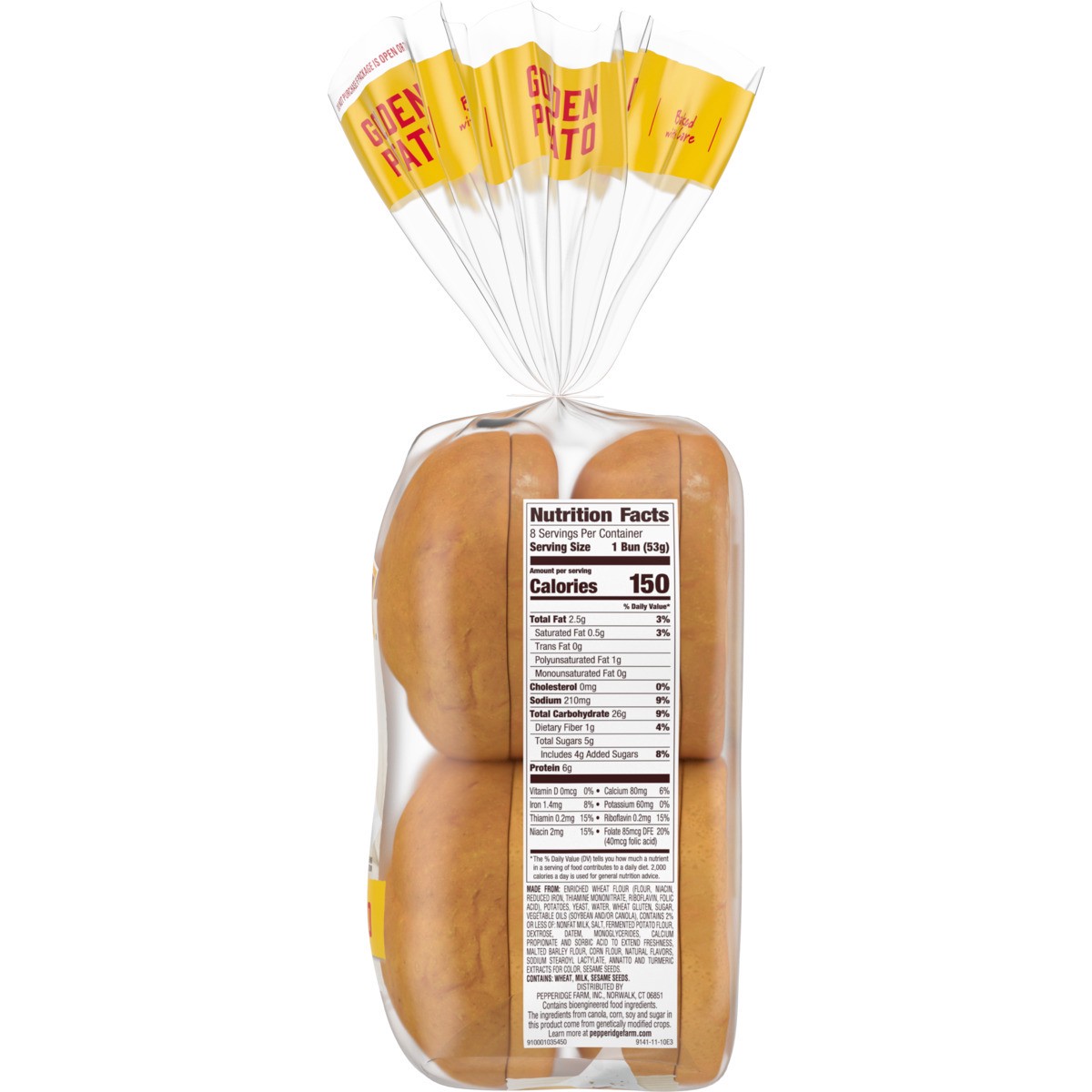 MADE FROM: ENRICHED WHEAT FLOUR (FLOUR, NIACIN, REDUCED IRON, THIAMINE MONONITRATE, RIBOFLAVIN, FOLIC ACID), POTATOES, YEAST, WATER, WHEAT GLUTEN, SUGAR, VEGETABLE OILS (SOYBEAN AND/OR CANOLA), CONTAI…