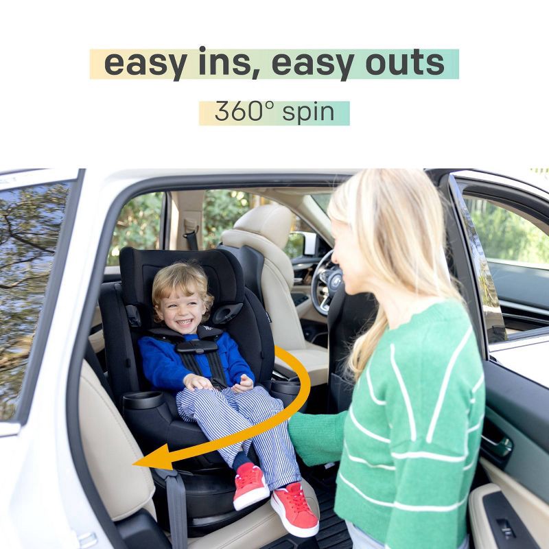 - Getting out the door with kiddos can be tough but buckling them in should be easy! The 360º spin that turns the car seat toward you so you can lift your child straight in and out of the car and fasten them while they're facing you.