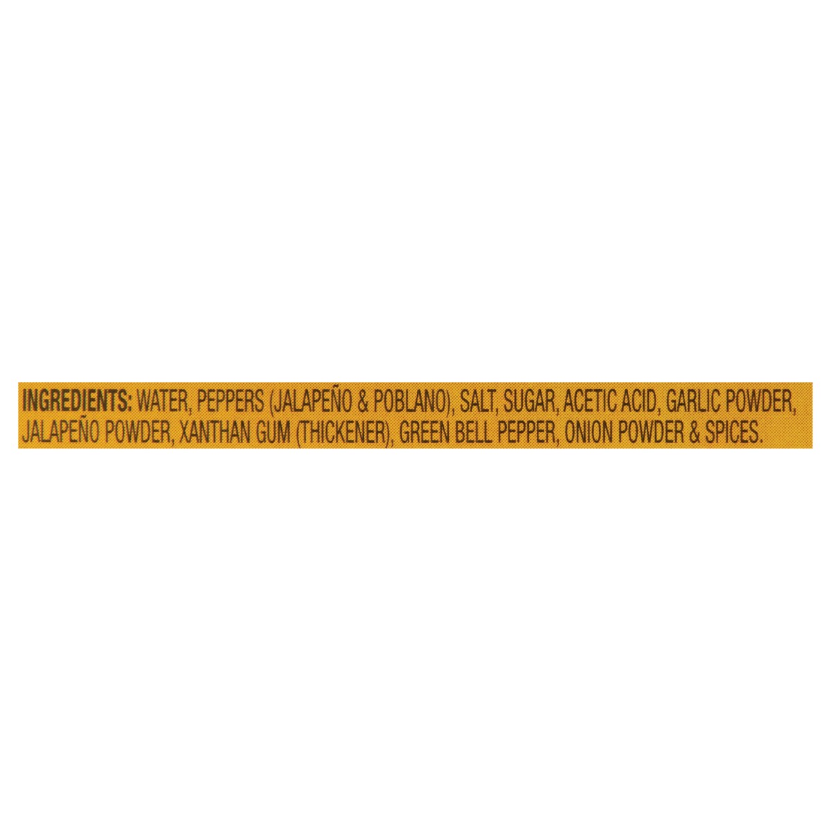 Jalapeño Pepper, Water, Sugar, Salt, Poblano Pepper, Acetic Acid, Garlic Powder, Jalapeño Powder, Xanthan Gum, Poblano Pepper Flavor, Sodium Benzoate (Preservative) and Sodium Metabisulfite (Preservat…