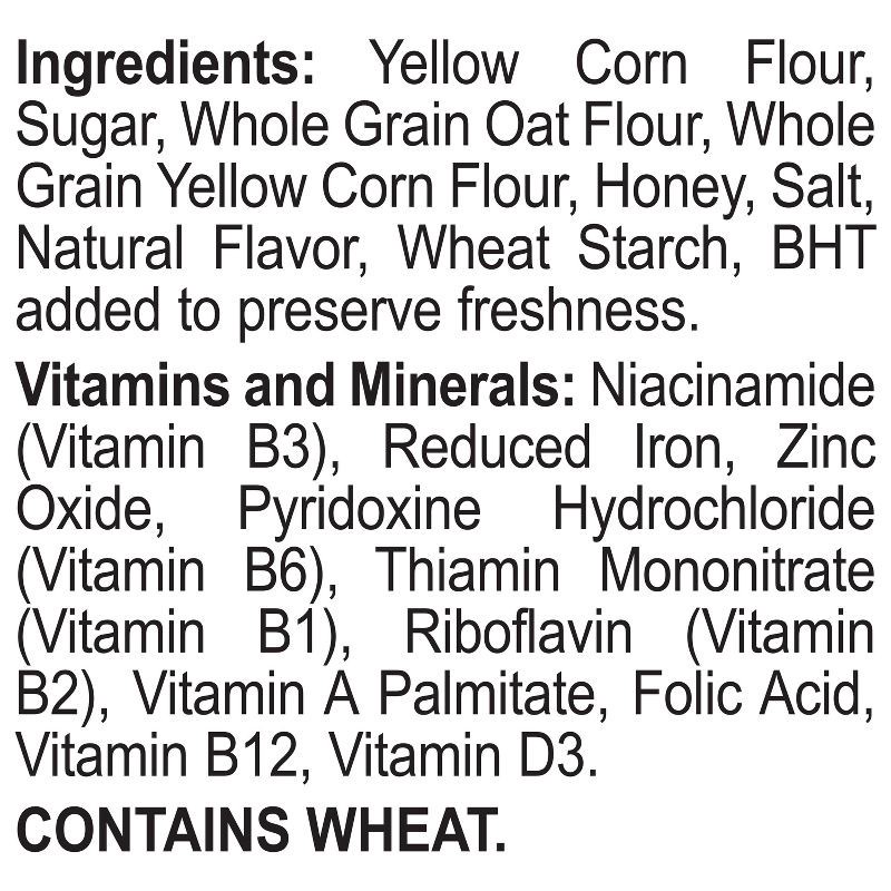 Yellow Corn Flour, Sugar, Whole Grain Oat Flour, Whole Grain Yellow Corn Flour, Honey, Salt, Natural Flavor, Yellow 5, Wheat Starch, BHT Added to Preserve Freshness, Vitamins and Minerals: Niacinamide…