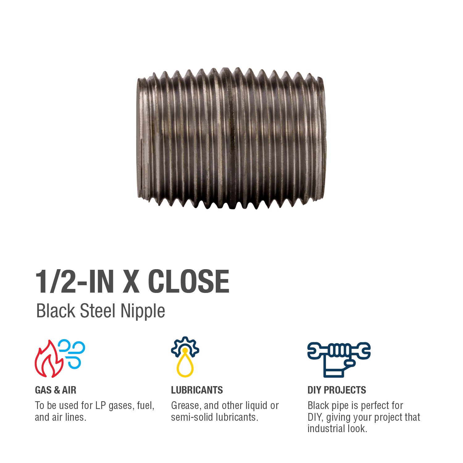 Generally used for lubricant, oil, grease, liquefied petroleum (LP) gas, natural gases (nitrogen, oxygen, etc.), steam and diesel. Schedule 40 nipple. Use to repair pipe or make an extension from a fi…