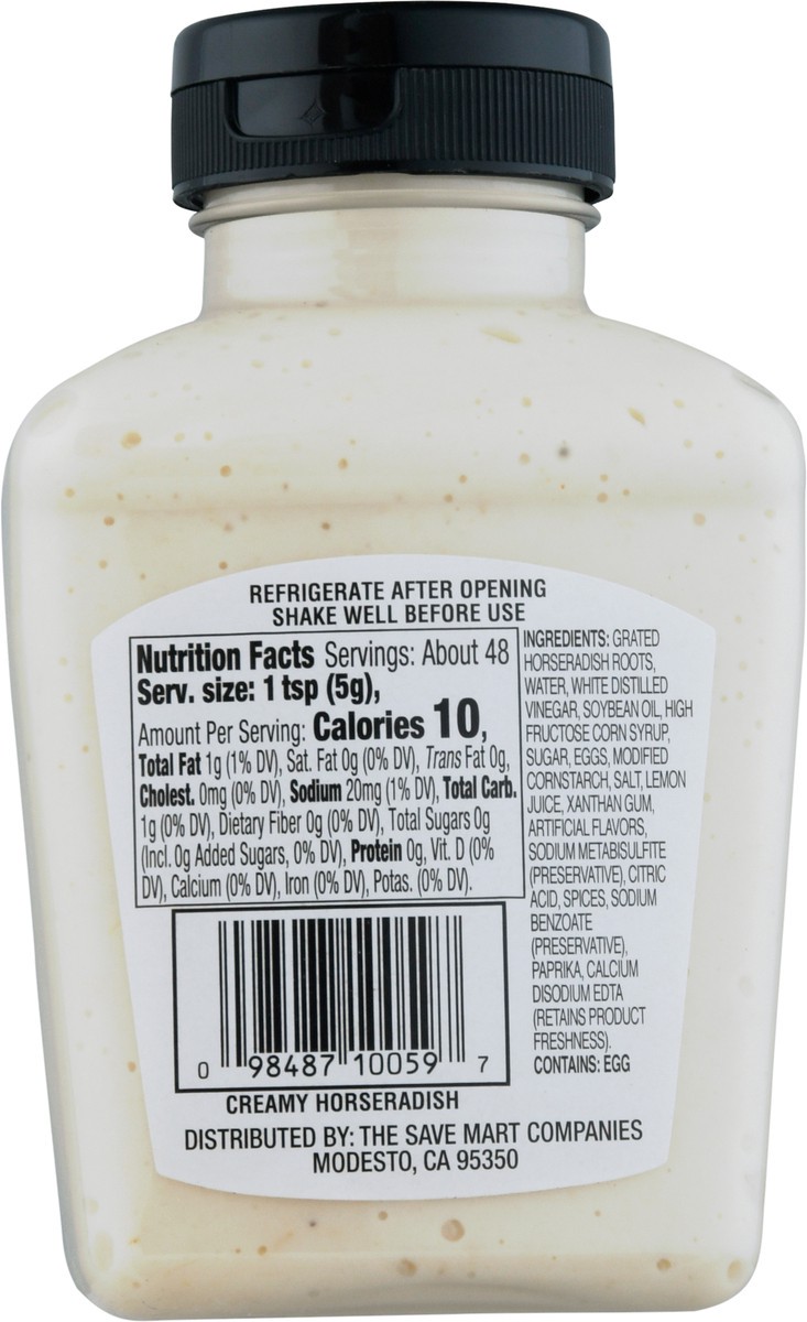 Grated Horseradish Roots, Water, White Distilled Vinegar, Soybean Oil, High Fructose Corn Syrup, Sugar, Eggs, Modified Cornstarch, Salt, Lemon Juice, Xanthan Gum, Artificial Flavors, Sodium Metabisulf…