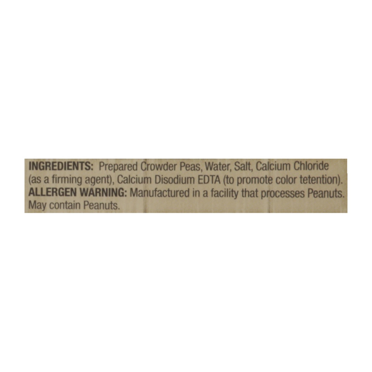 Prepared Crowder Peas, Water, Salt, Calcium Chloride (as a Firming Agent), Calcium Disodium EDTA (to Promote Color Tetention).