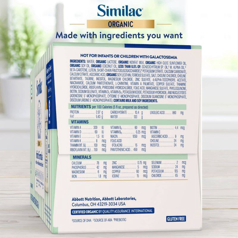 WATER, ORGANIC LACTOSE, ORGANIC NONFAT MILK, ORGANIC HIGH OLEIC SUNFLOWER OIL, ORGANIC SOY OIL, ORGANIC COCONUT OIL; LESS THAN 0.5% OF: SCHIZOCHYTRIUM SP. OIL,§ M. ALPINA OIL, BETA-CAROTENE, LUTEIN, S…