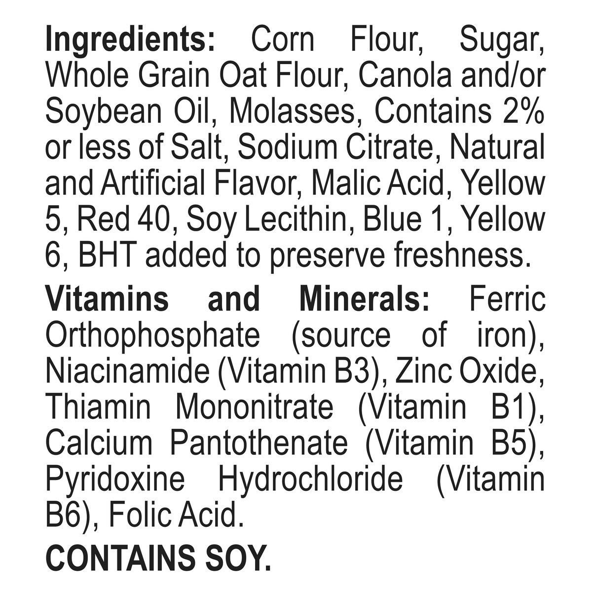 Corn Flour, Sugar, Whole Grain Oat Flour, Canola and/or Soybean Oil, Molasses, Contains 2% or less of Salt, Sodium Citrate, Natural and Artificial Flavor, Malic Acid, Yellow 5, Red 40, Soy Lecithin, B…