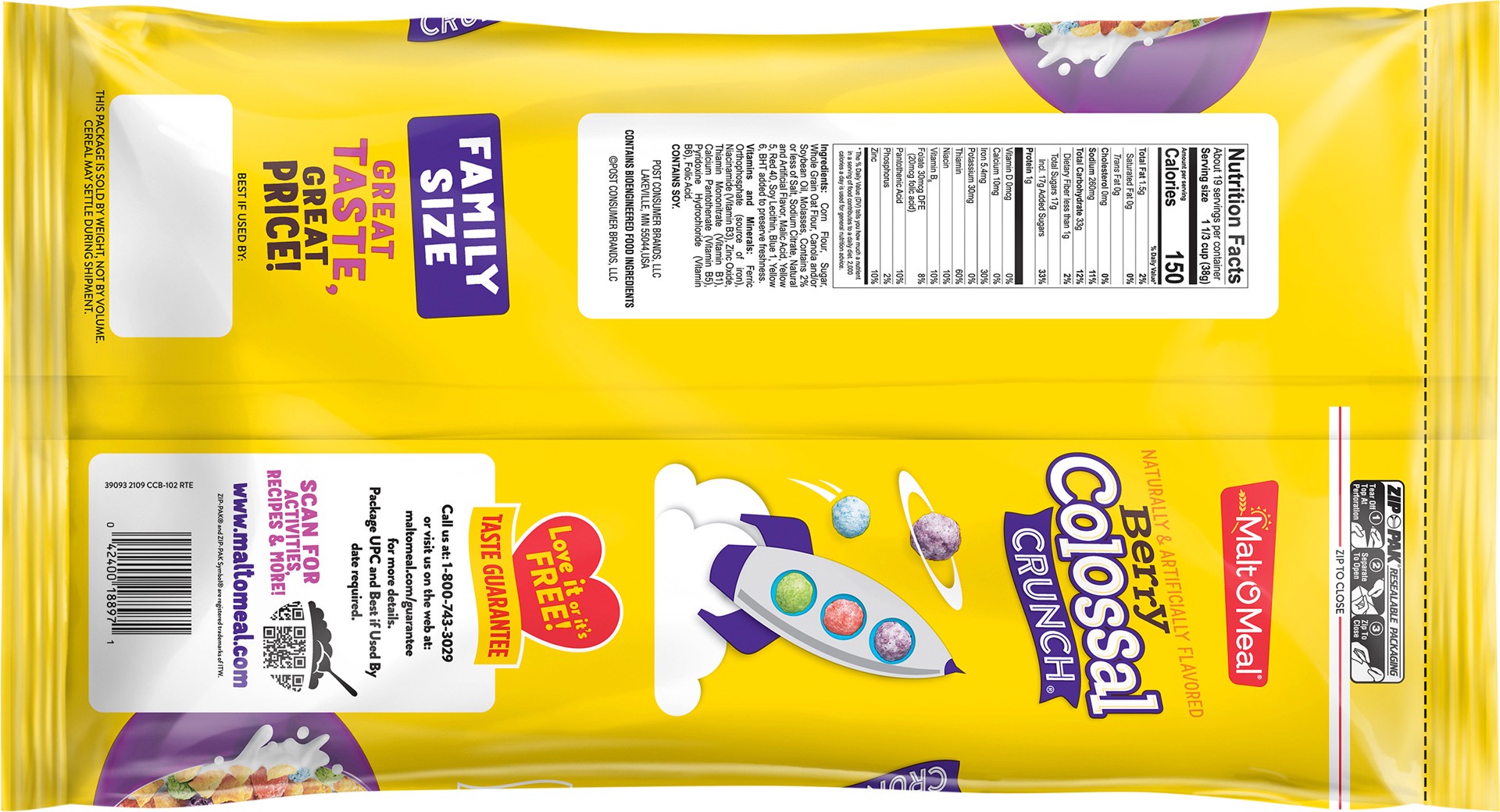 Malt O Meal Berry Colossal Crunch Breakfast Cereal packs big flavor and even bigger crunch in your morning breakfast. This Malt O Meal cereal is filled with bite-sized pieces of crunchy corn and oat c…