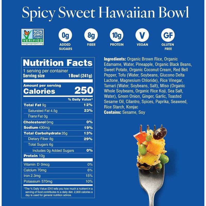 ingredients: organic brown rice, organic, edamame, water, pineapple, organic black beans,, sweet potato, organic coconut cream, red bell, pepper, tofu (water, soybeans, glucono delta, lactone, magnesi…