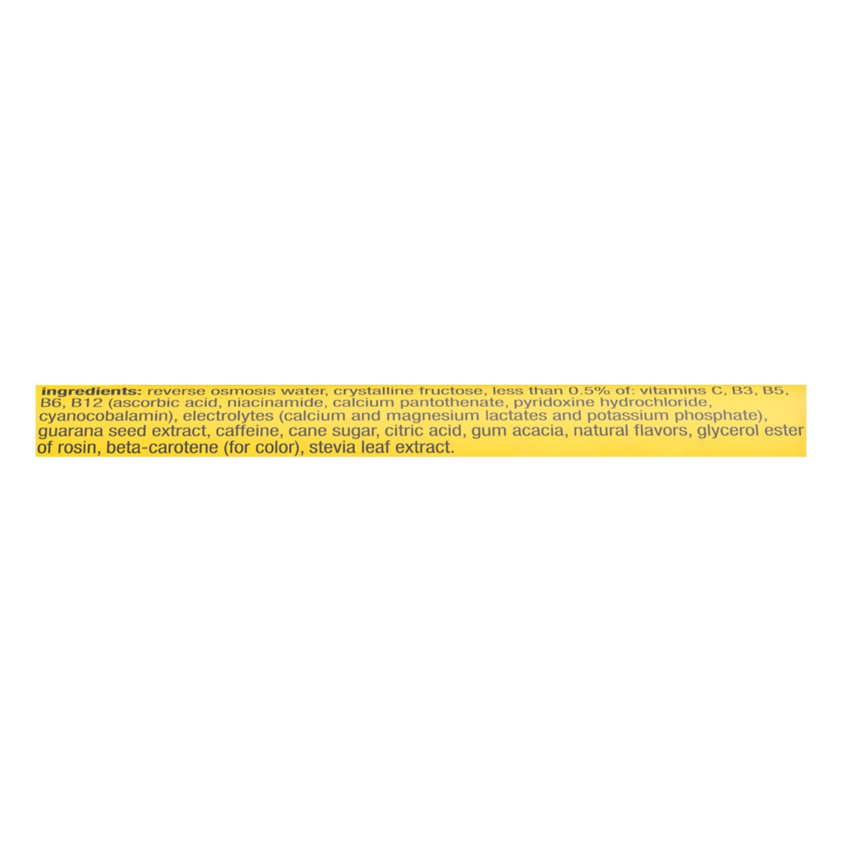 Reverse Osmosis Water, Crystalline Fructose, Less Than 0.5% Of: Vitamins C, B3, B5, B6, B12 (Ascorbic Acid, Niacinamide, Calcium Pantothenate, Pyridoxine Hydrochloride, Cyanocobalamin), Electrolytes (…