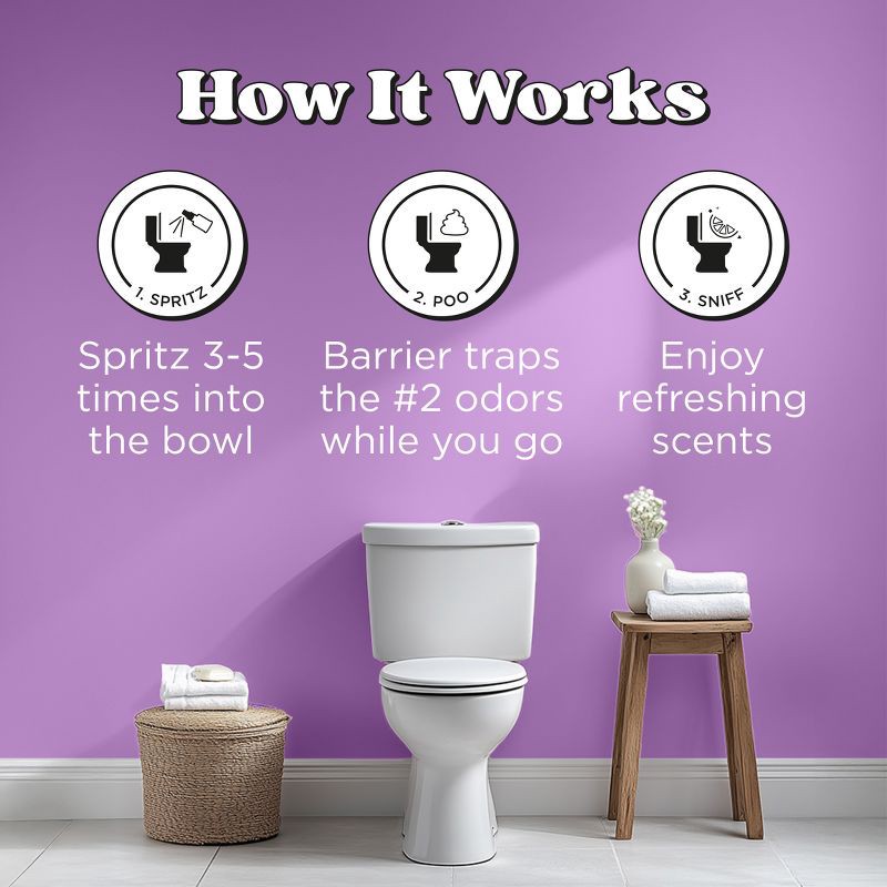 - Stops odors before they begin – just spritz 3-5 sprays into the toilet bowl before you go, and trap odors below the surface