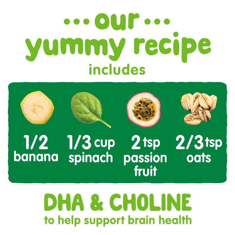 Organic Banana Puree, Water, Organic Passion Fruit Puree, Organic Spinach Puree, Organic Orange Puree, Milled Organic Whole Grain Oats, <2% of: Choline Bitartrate, DHA Algal Oil, Organic Lemon Juice C…