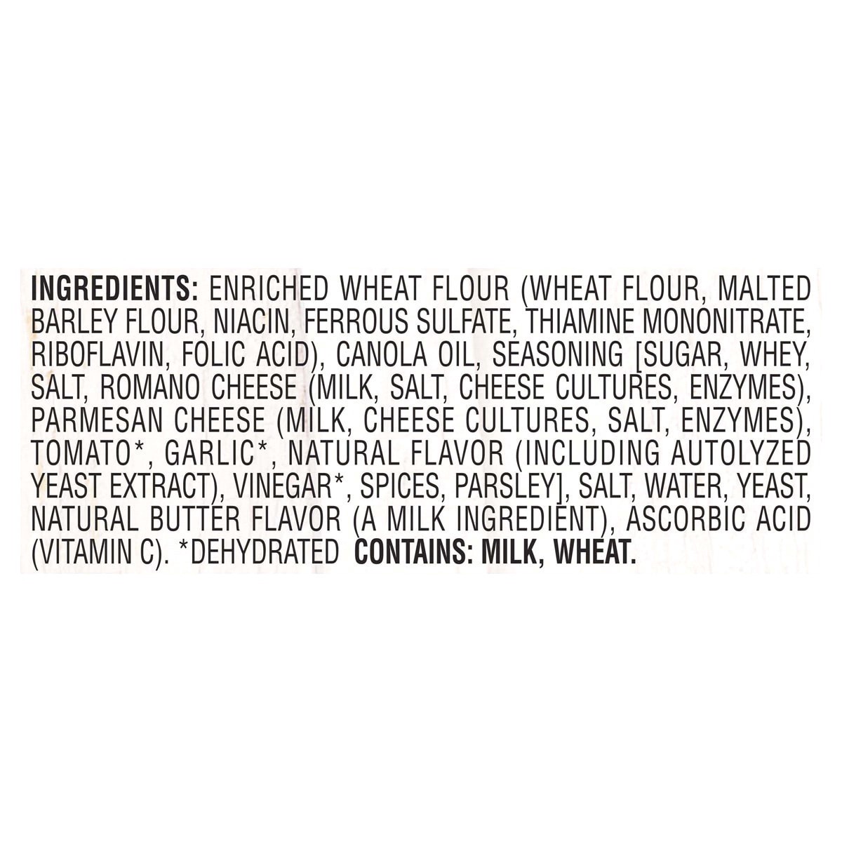 Ingredients: Enriched Wheat Flour (Wheat Flour, Malted Barley Flour, Niacin, Ferrous Sulfate, Thiamine Mononitrate, Riboflavin, Folic Acid), Canola Oil, Seasoning [Sugar, Whey, Salt, Romano Cheese (Mi…