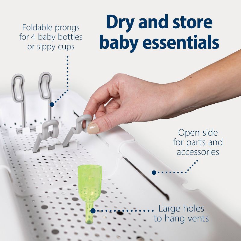 - STORE MULTIPLE BABY BOTTLES AND PARTS. Foldable prongs securely hold 4 baby bottles or cups and the open side stores and dries bottle parts and other baby items. Larger holes are perfect for storing and drying Dr. Brown's vents.