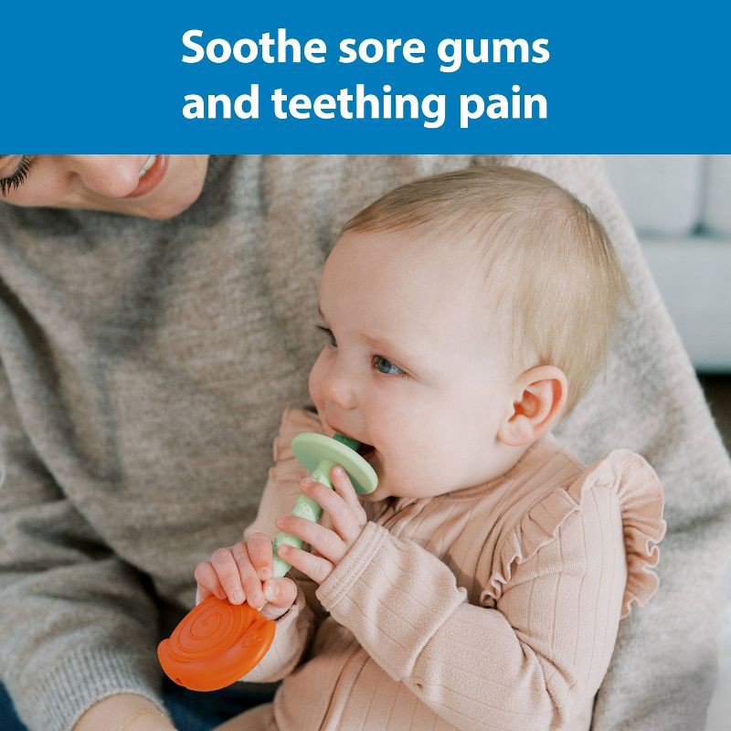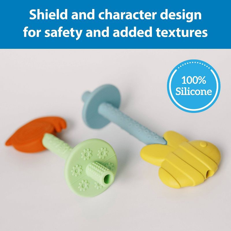 - SAFE & FUN. Each teething tube features a textured shield on one end and a colorful character on the other for safety and a firmer bite.