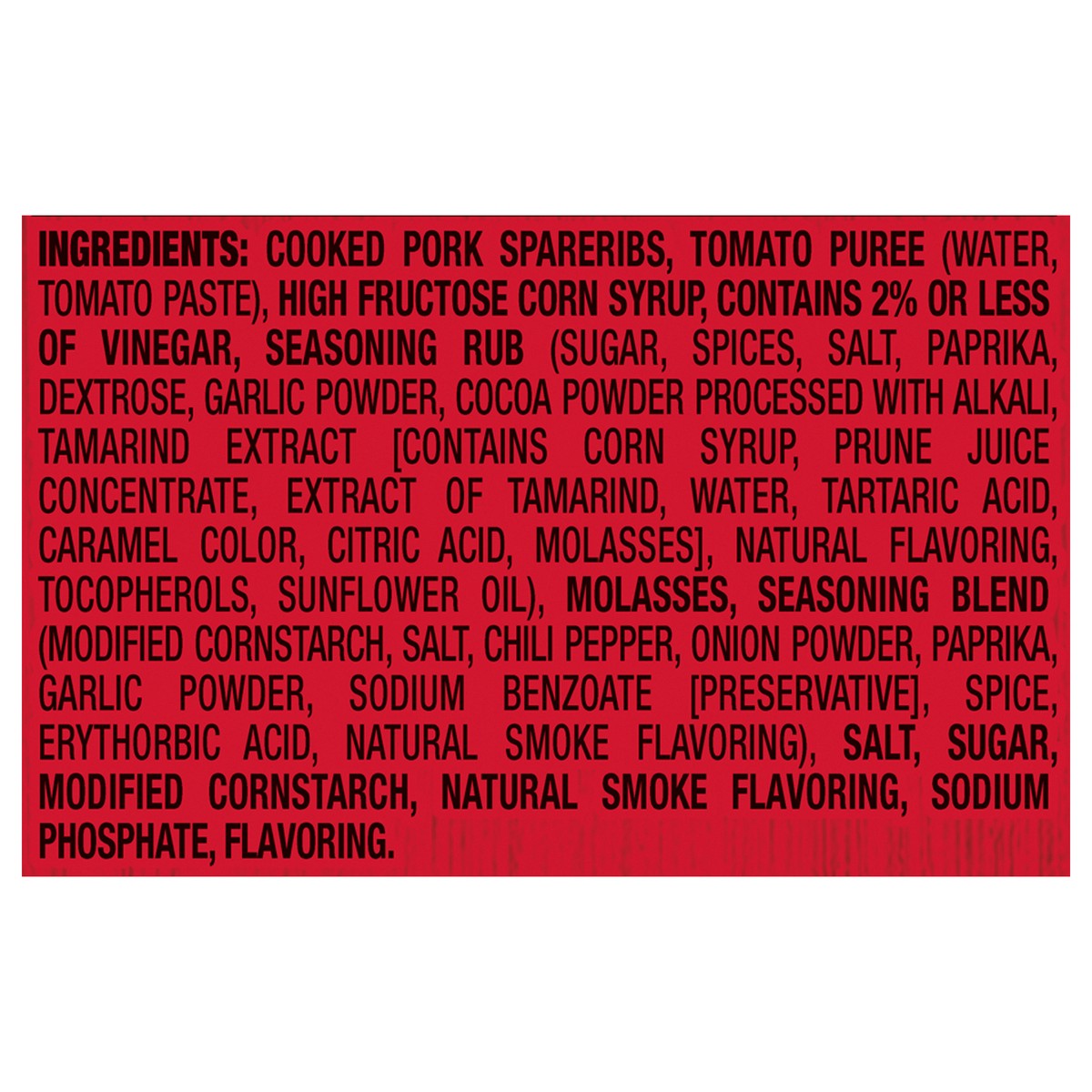 NATURAL SMOKE FLAVORING ADDEDIngredients: Cooked Pork Spareribs, Tomato Puree (Water, Tomato Paste), High Fructose Corn Syrup, Contains 2% or less of Vinegar, Seasoning Rub (Sugar, Spices, Salt, Papri…