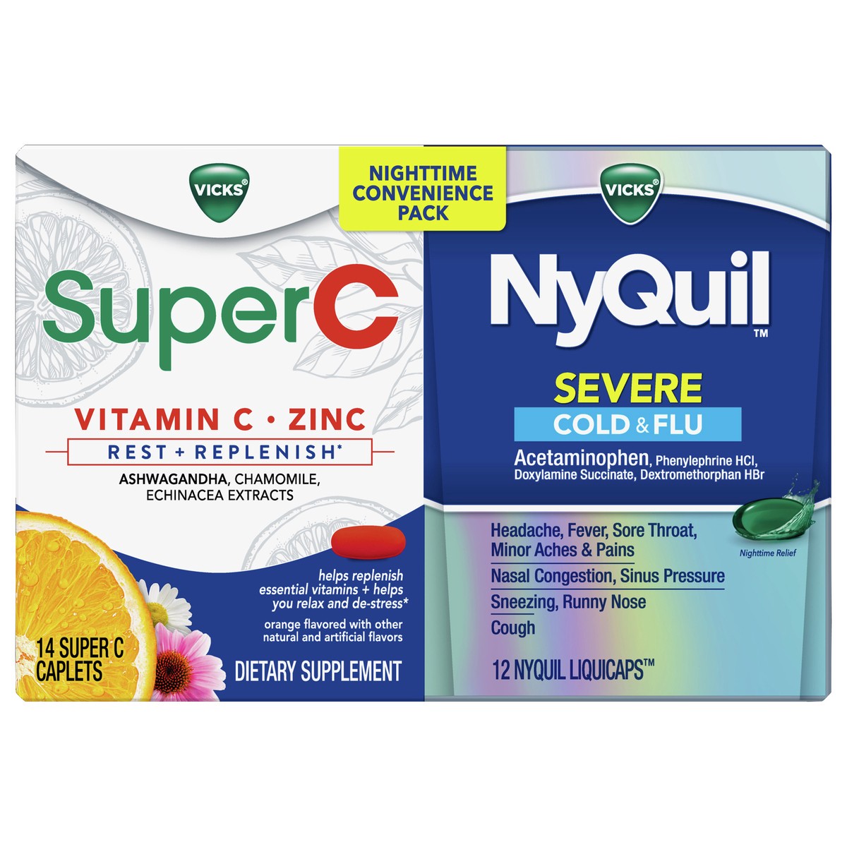VICKS NYQUIL SEVERE AND SUPER C CONVENIENCE PACK HELPS MAKE YOUR LIFE SIMPLER. Nyquil Severe is the is the max strength, nighttime, sniffling, coughing, congested head, fever, best sleep with a cold, …