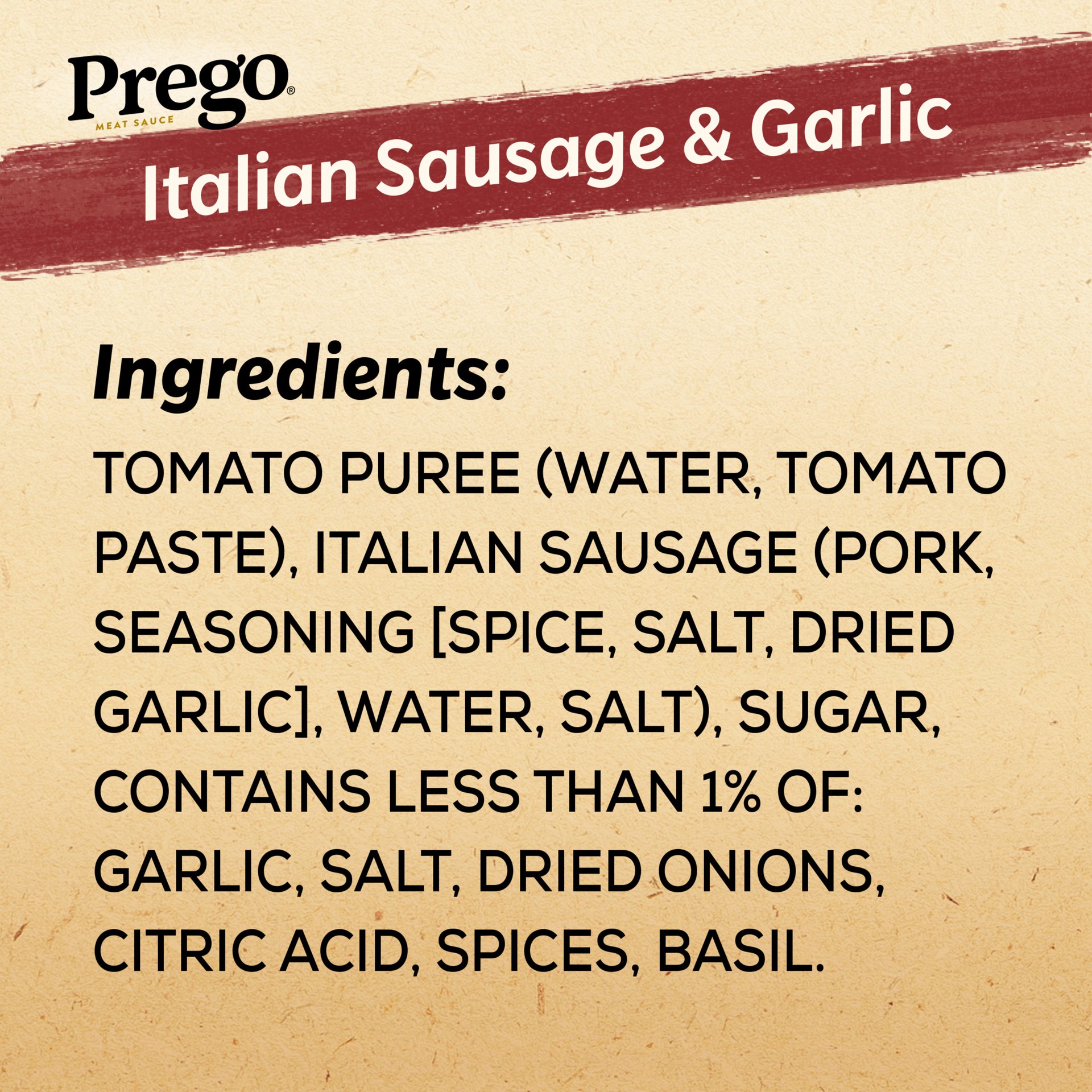 INGREDIENTS: TOMATO PUREE (WATER, TOMATO PASTE), ITALIAN SAUSAGE (PORK, SEASONING [SPICE, SALT, DRIED GARLIC], WATER, SALT), SUGAR, CONTAINS LESS THAN 1% OF: GARLIC, SALT, DRIED ONIONS, CITRIC ACID, S…
