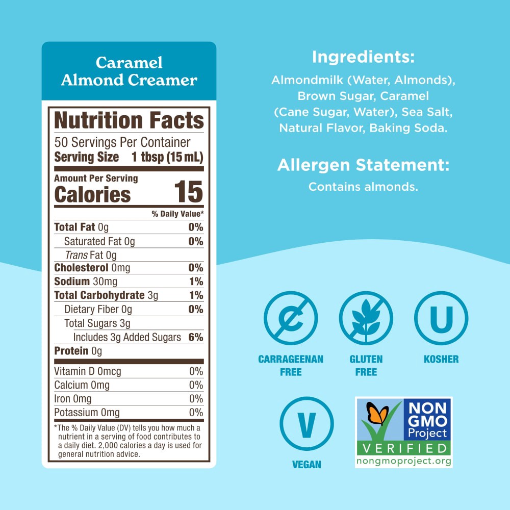 Almondmilk (Water, Almonds), Cane Sugar, Sunflower Oil, Caramel (Cane Sugar, Water), Natural Flavor, Sunflower Lecithin, Calcium Carbonate, Sea Salt, Potassium Citrate, Locust Bean Gum, Gellan Gum.